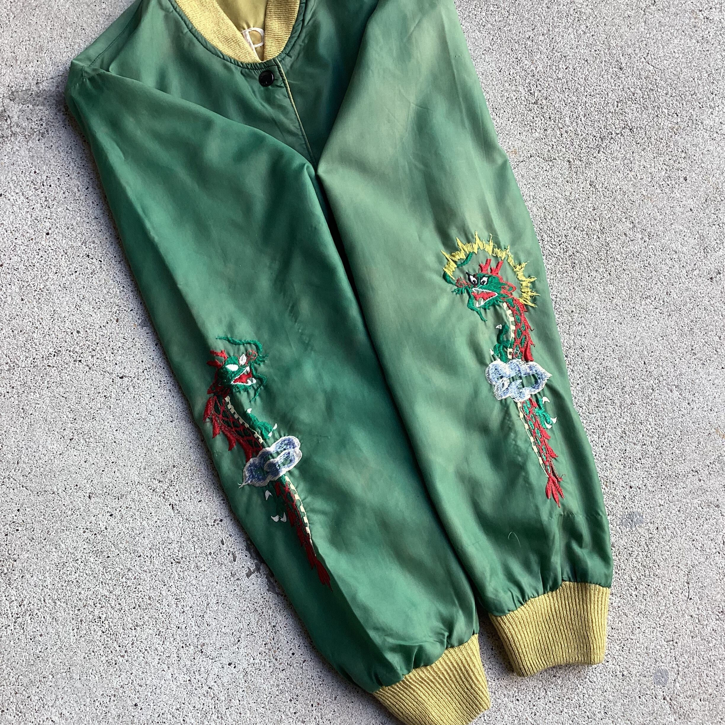 80年代頃のスーベニアジャケットになります。ボタンタイプは初見でした。A面B面どちらも良い面構えです。緑の方の右袖の龍の刺繍だけ目玉と雷の刺繍がされておらず、途中で諦めたのかなと推測しています。これもアメリカ特有の大雑把さなのでしょうか笑。しかしながらポケットの部分の刺繍はかなり細かいので、かなり偏ったこだわりなのだと思います。状態としては、黄色の方はそれほど褪色感はなく、緑のバックの部分だけ若干褪せが見られます。リブは虫食いやほつれがなくかなり良い状態と言えます。変わり種の古着好きは是非。