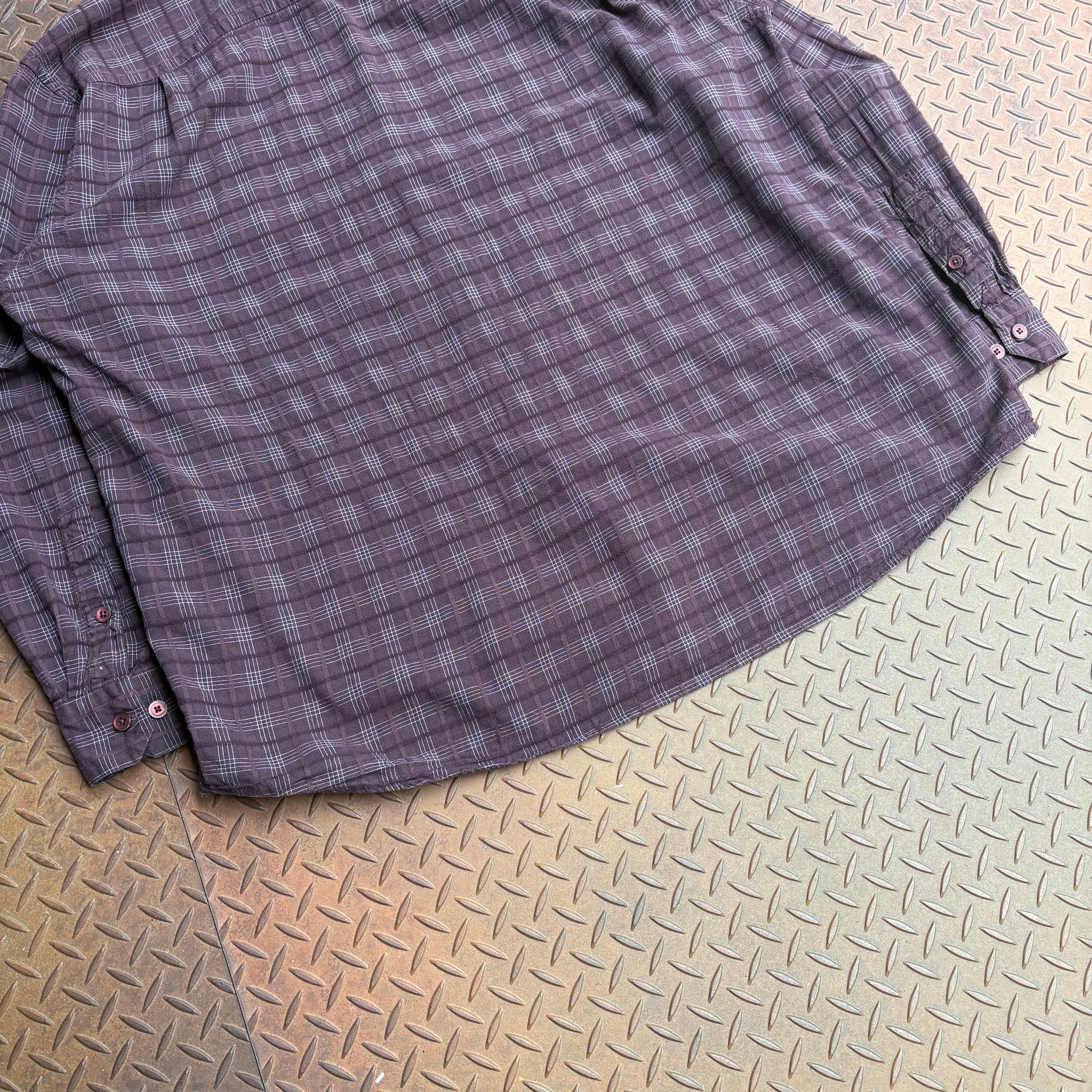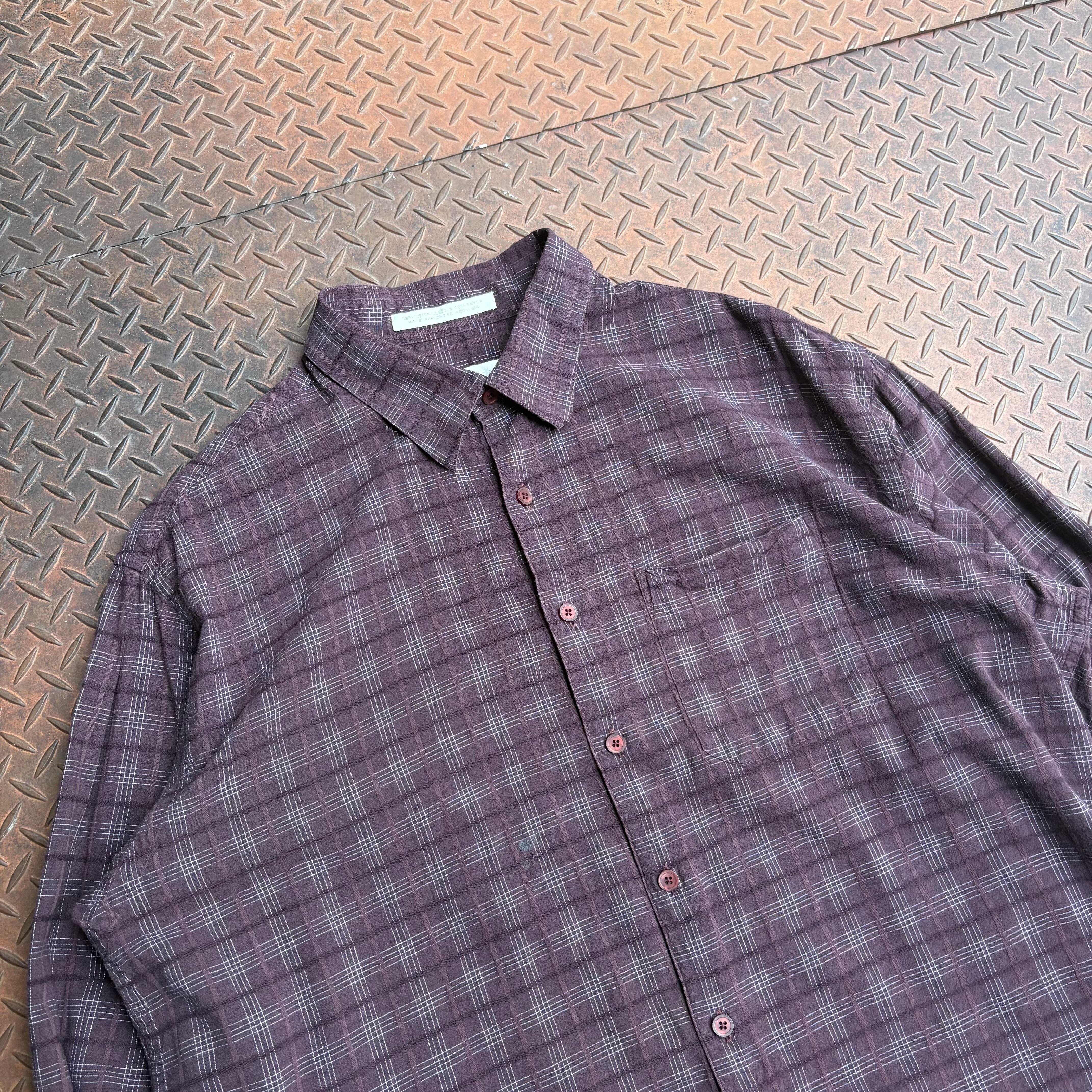 90年代頃のPERRY ELLISのチェックシャツになります。ペリエリらしくレーヨン混のシャツで、色味も落ち着いたきやすいシャツ。しれっと柄合わせなんかもされていてさすがといった印象。紫ベースで白のラインと同色のラインでのチェックというのが、主張しすぎず、ブランドらしさが出ているかと思います。