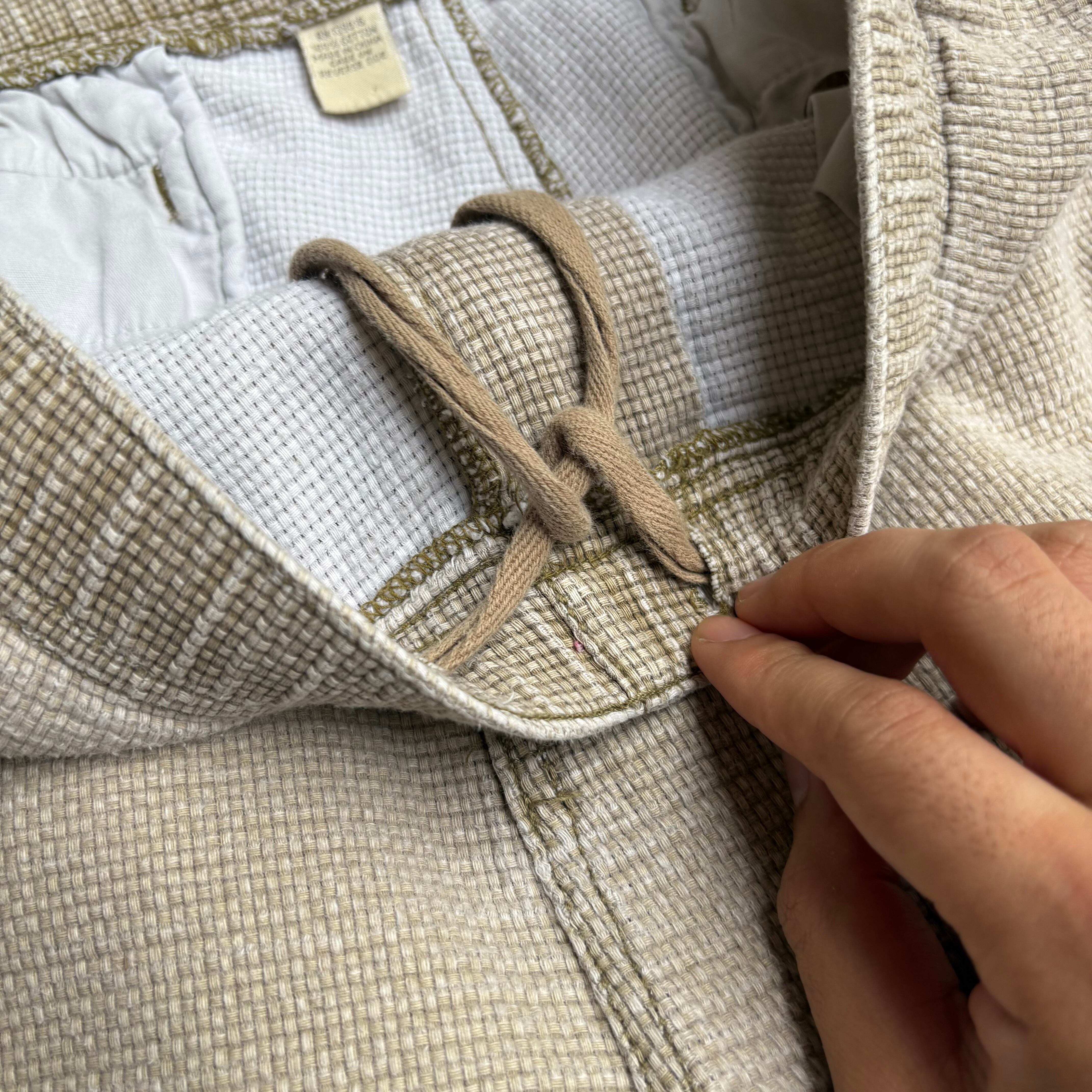 90年代頃のThe Territory Aheadのハーフパンツになります。テリトリーアヘッドといえば、思いあたるのはシャツが多いイメージですが、しっかりパンツなんかもあるんです。そして着目すべき点はやはり、この織り方でしょう。厚めのコットンの平織りです。涼しげな雰囲気もありつつ、丈夫な印象。一目で、このブランドの特徴がつかめますよね。このハーフパンツは、イージーパンツ仕様になっており、ウエストは大きめですが、かなり広範囲での調整が可能ですので、細身の方でも十分着用できるかと思います。夏はシャツとサンダル合わせで快適にオシャレするのもいかがでしょうか。