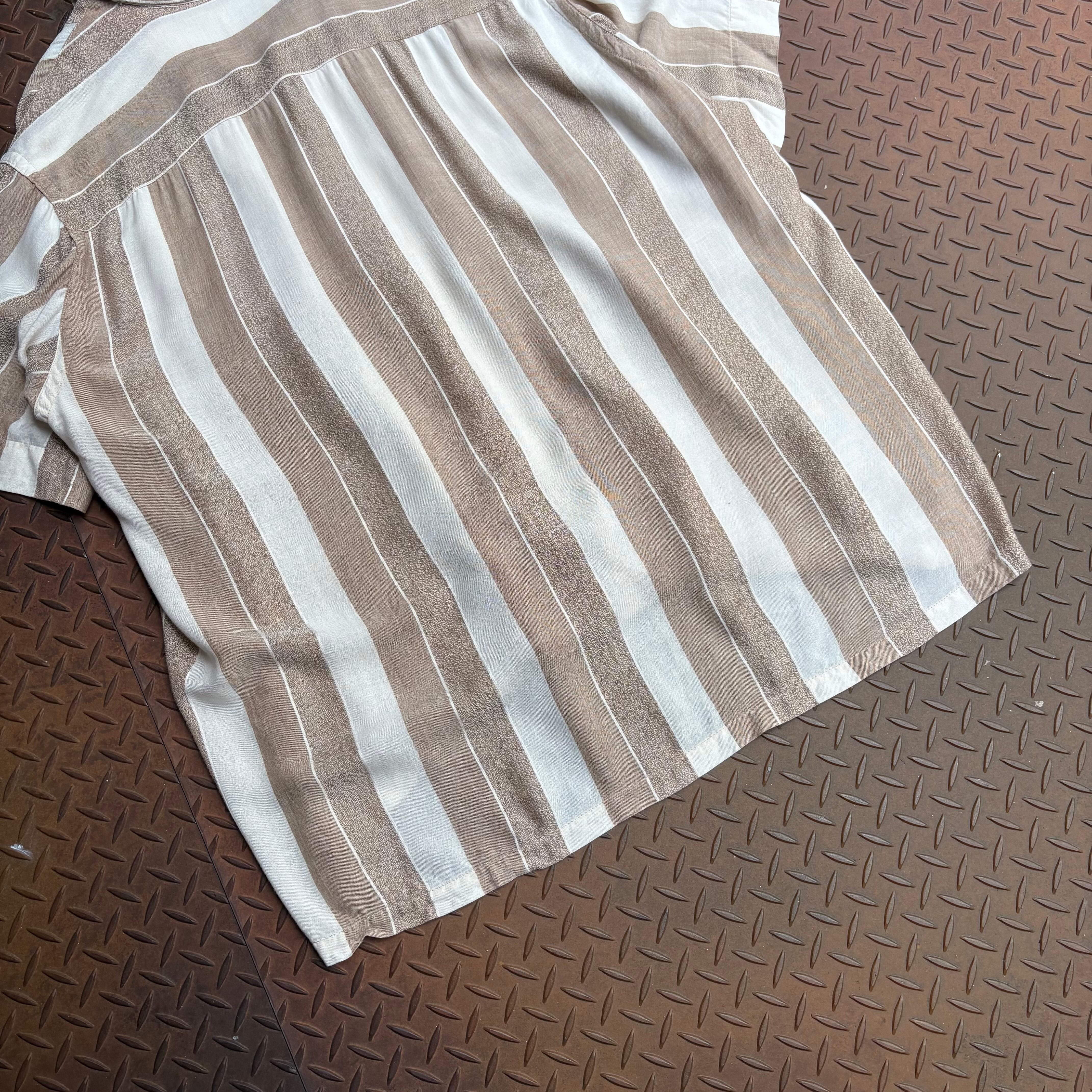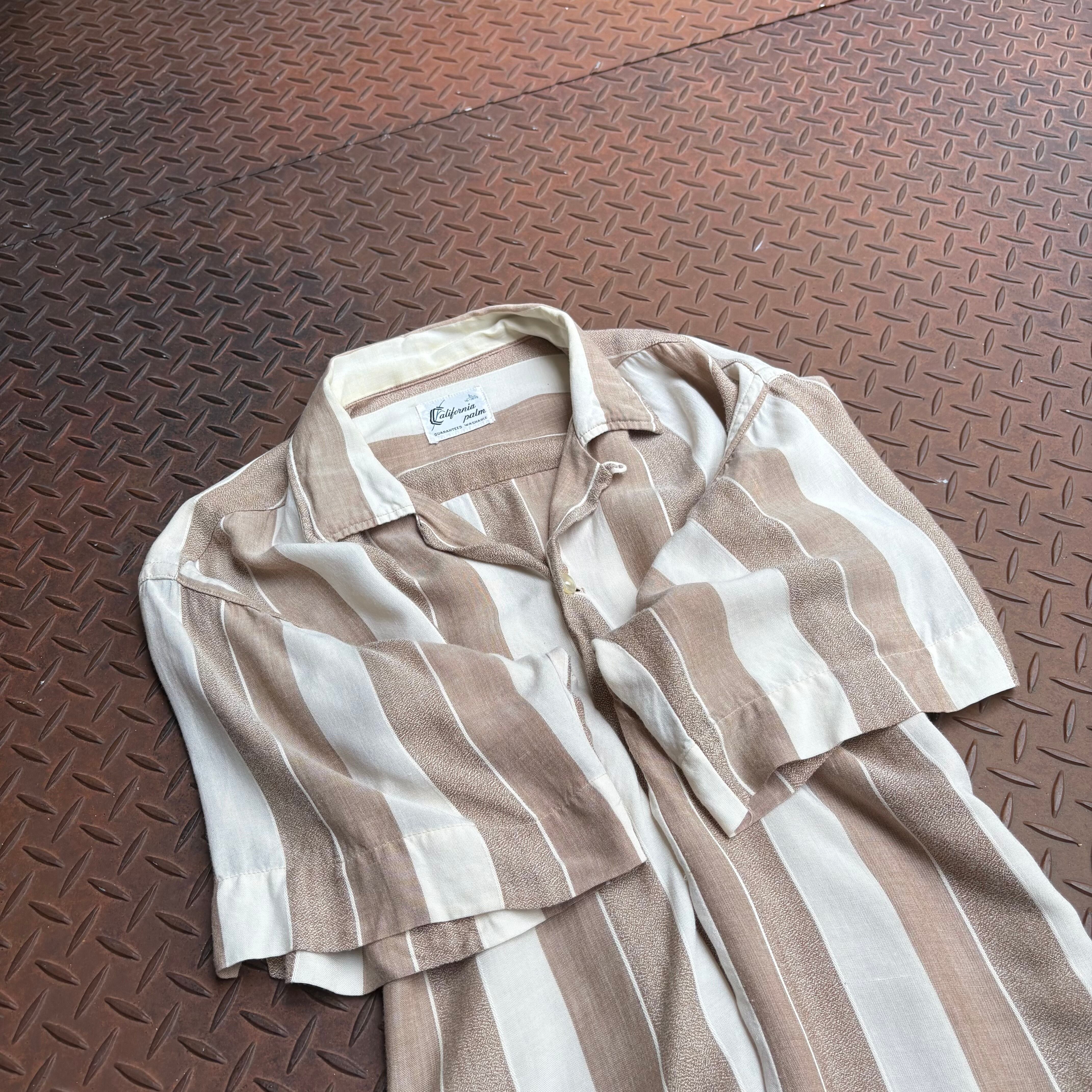 60年代から70年代頃のCatalinaの半袖レーヨンシャツになります。Catalinaといえば、今期流行ったキャップショルダージャケットでも有名なブランドで、ほか作っているものでいえば、総柄のアロハっぽいシャツを作っているイメージもあります。そんな中の一着で、レーヨン素材の太めのストライプシャツ。涼しげな素材感、柄ですが、カラーは落ち着いたベージュ系で、かなり着やすいデザインです。半袖シャツは基本的に派手なものが多いので、落ち着いているのも嬉しいポイントです。ヴィンテージ特有のレーヨンのトロッとした質感で、思わず触りたくなるような素材感、お探しの方はお早めに。