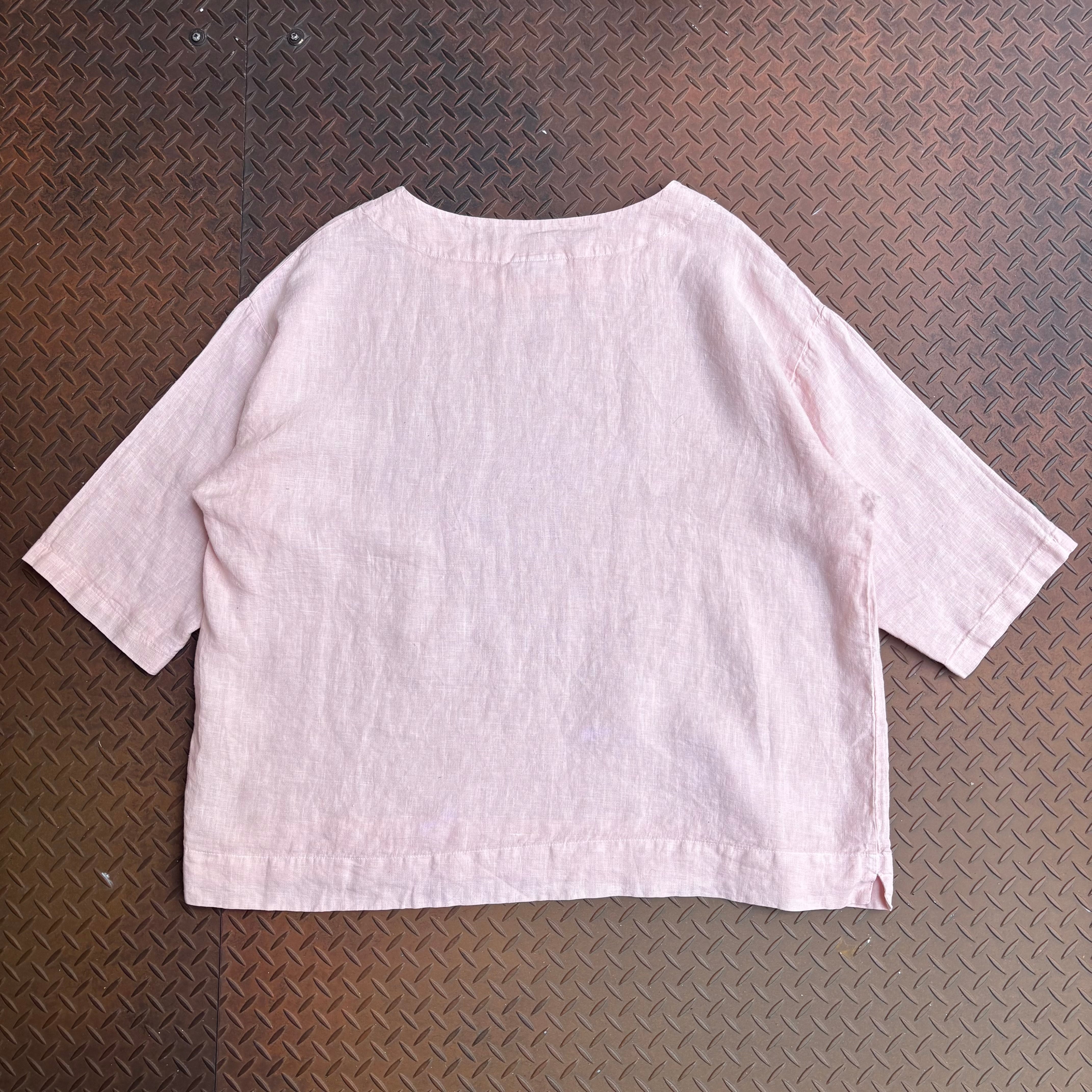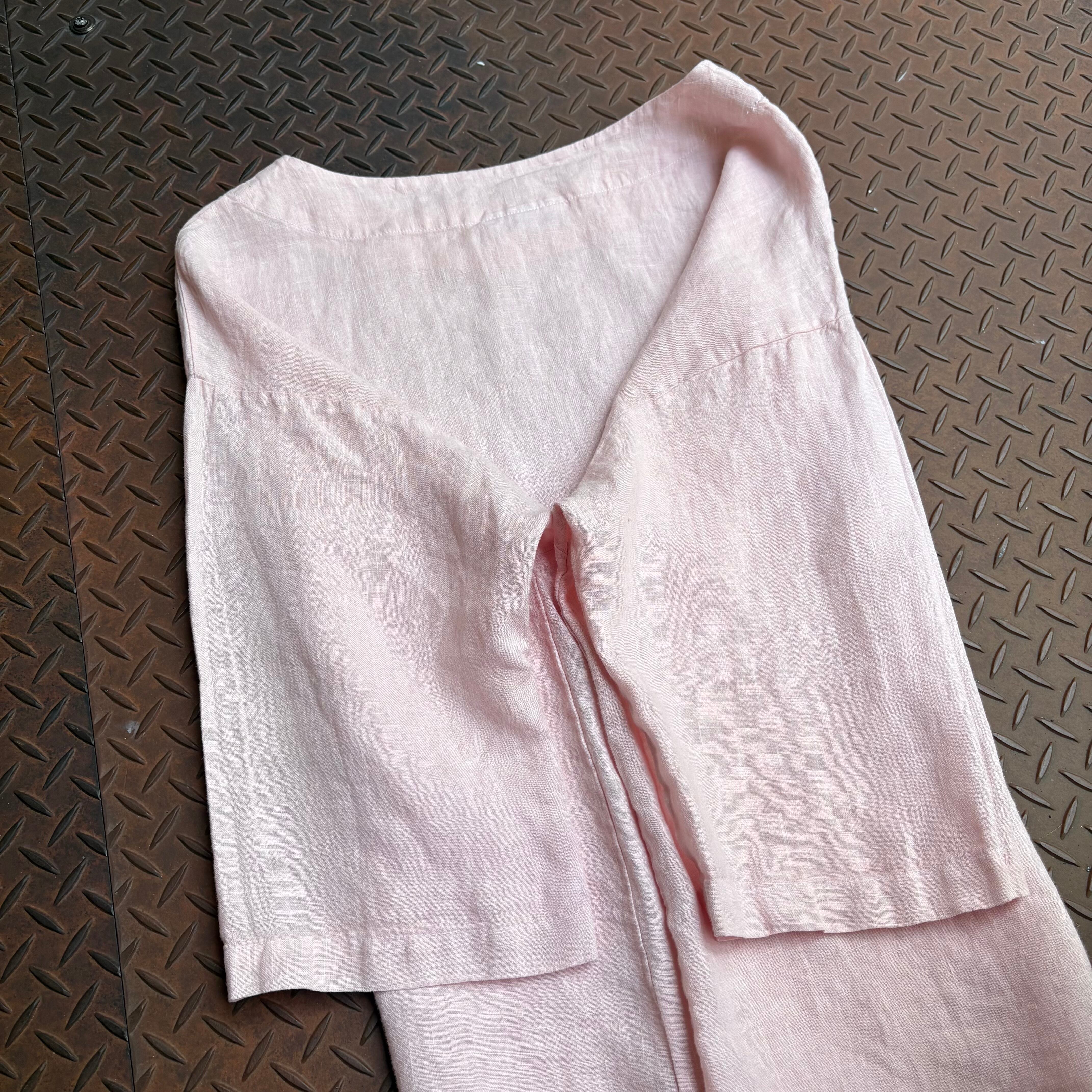 90年代brny walkerのリネンカットソーになります。初見ブランドでしたが、FLAXやGOOUCH、CHICO’s系の服を作っているみたいです。言われてみれば、リネンを使っていることや、デザインもどことなくそんな感じしますよね。ブルんと跳ねるような質感の100%リネン、身幅がたっぷりとあるカットソーで、ネックがボートネックのような作りで、一見広すぎるように見えますが、着て見るとやりすぎていない丁度いい開き具合でした。袖の長さも5部丈くらいの長さで、ボディの大きさとバランスのとれた作りになっています。そしてこの感じでUSA製なのが古着好きとしても嬉しいポイントではないでしょうか。