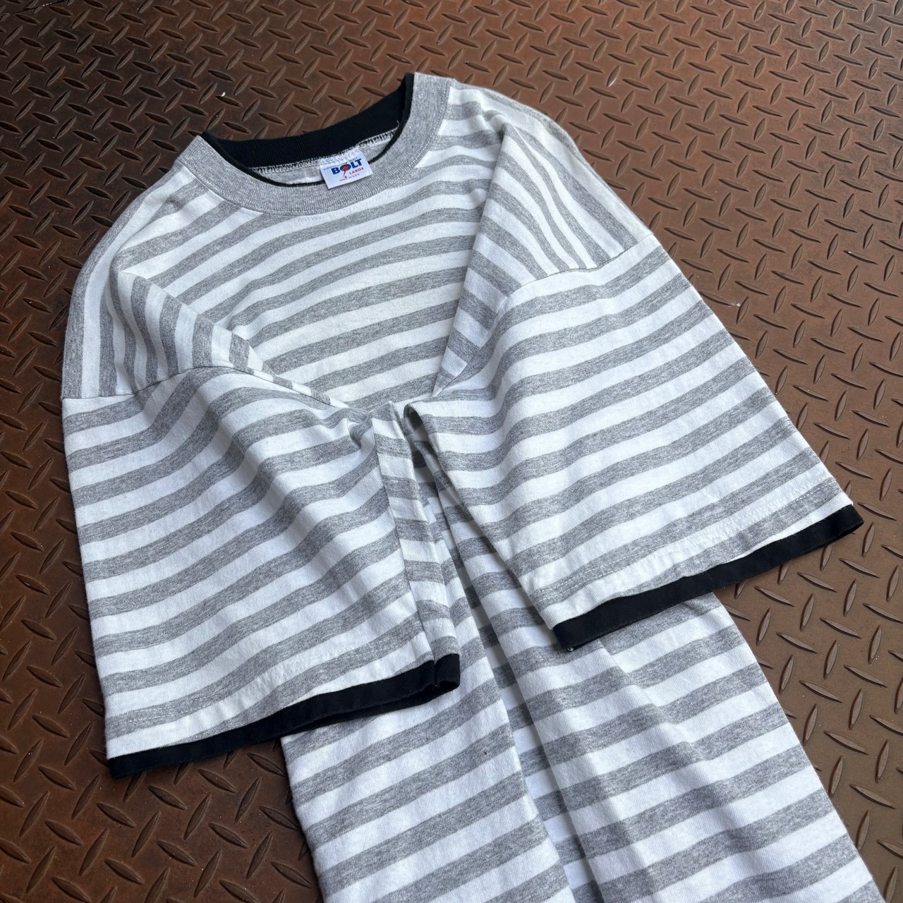 90年代頃のLIGHTNING BOLTのボーダーTシャツになります。このブランドといえば、オールドサーフですね。80年代から90年代にかけて一斉を風靡したブランドで、サーフィンをしている方なら一度は聞いたことがあるでしょう。ものとしては、サーフ系によくあるグレーのボーダーで、襟がダブルカラーになっている仕様。好きな人にはたまらない仕様かと思います。胸にはワンポイントのボルトマン。色味使いがいかにもな感じですね。STUSSYやOP、QUICKSILVERなど横ノリ好きは是非。