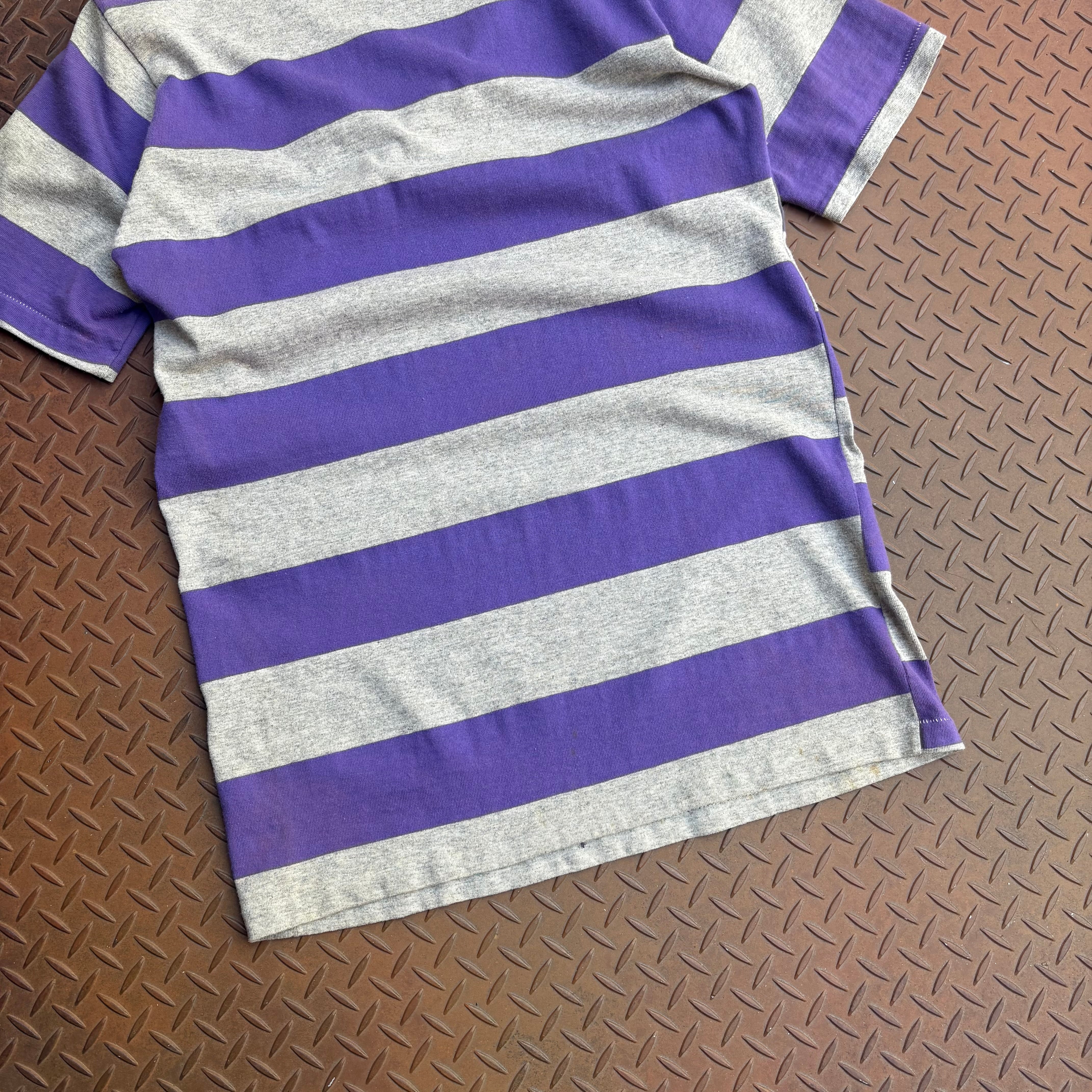 80年代から90年代頃のボーダーTシャツになります。太めのボーダーでサーフカルチャーのプンプンする一着。身幅やや細め、着丈やや長めの70年代のスタイルにやや引っ張られている、やや絶妙なシルエット。こんなんにフレアパンツ履いてビーサンとかめちゃくちゃ良さそうです。紫とグレーという毒々しい悪ノリな配色もポイント高いですね。オールドサーフのバックプリントだけのTシャツは飽きてしまったよという人に強くおすすめしたい一着です。