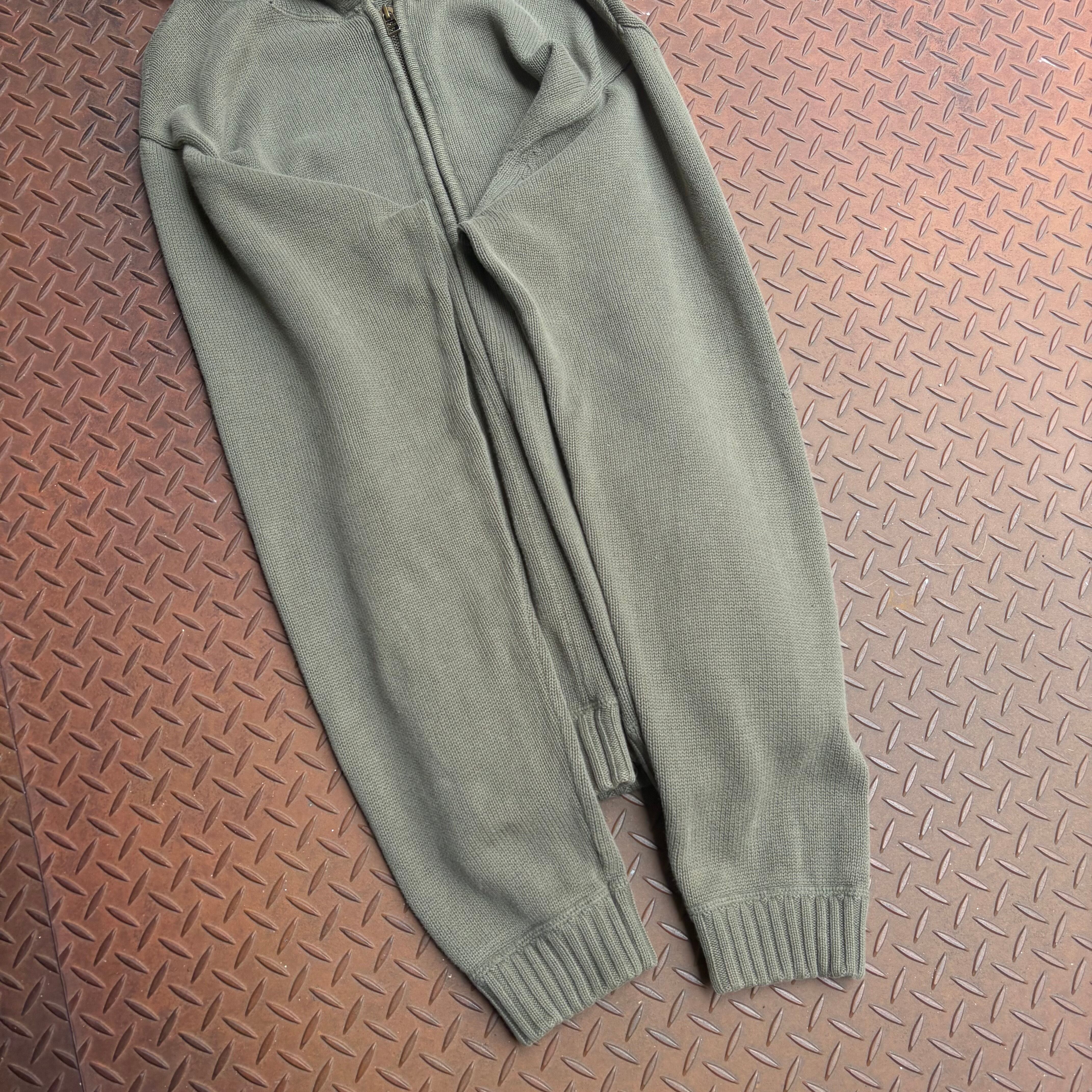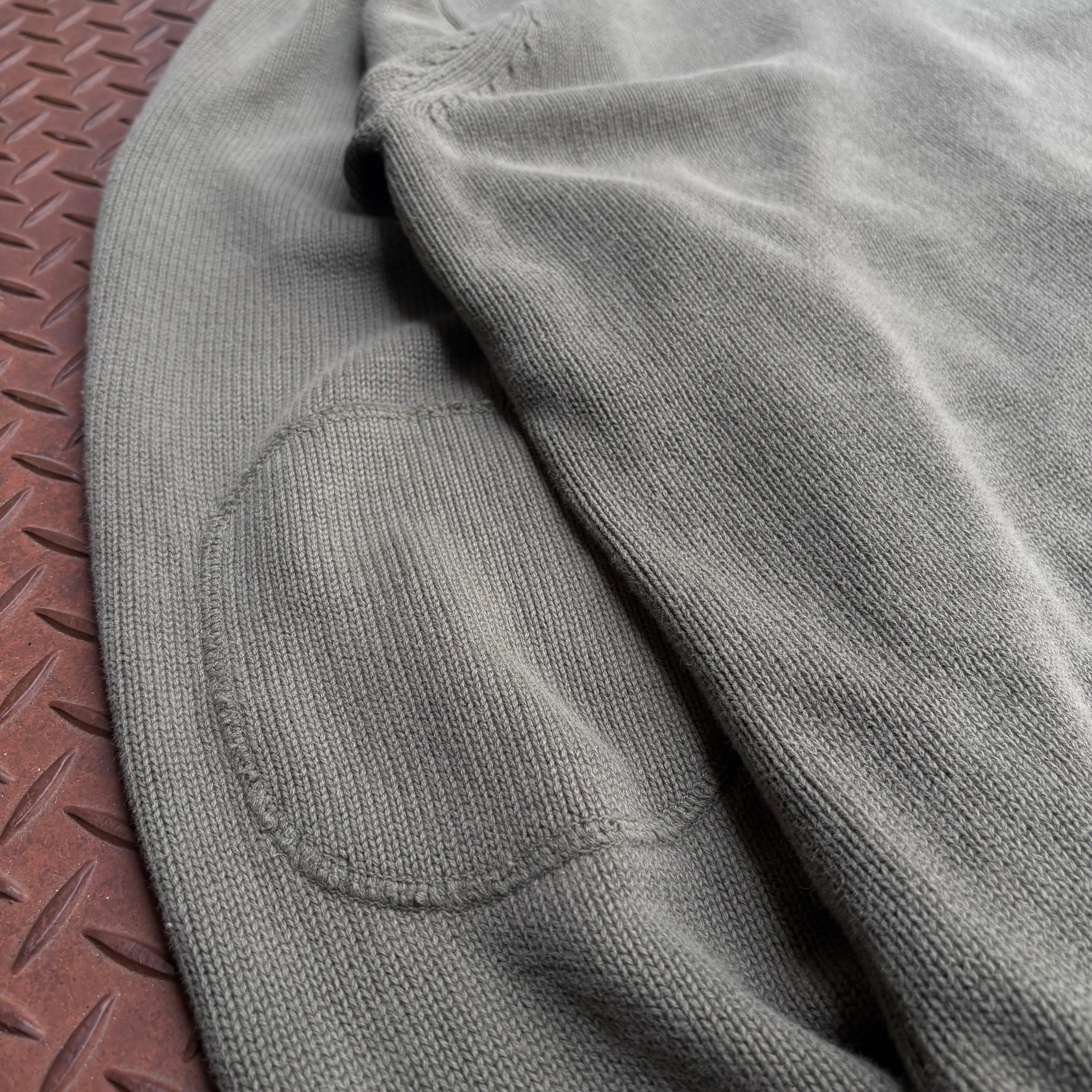 00年代のIZODのコットンニットフーディになります。比較的近年ものですが、IZODもここまでやるのかと驚かされました。大ぶりなコットンニットというだけで良いのに、フードをつけてパーカー仕様、ジップアップ式でダブルジップ、レザーとかではなく同色の糸を用いてエルボーパッチまで。こんな服あったらいいなっていうのを完璧に仕立て上げてくれてます。フードもガバッとかぶれる十分な大きさで、身幅も広くアームホールも広いゆったりなサイズ感。探しても出てこないであろうグッドレギュラーです。お好きな方は是非。