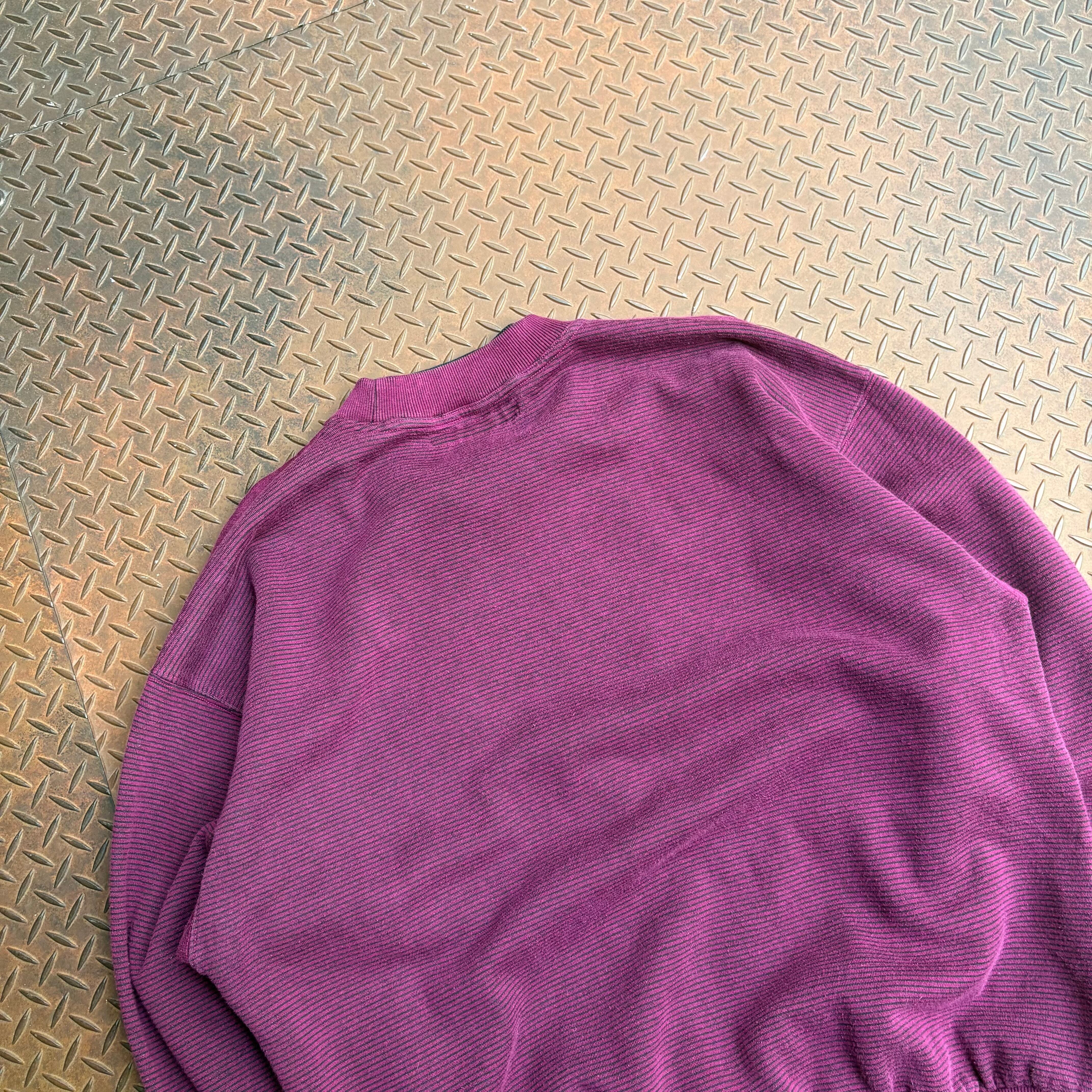 90年代頃のINSTROPECTのスウェットになります。80年代から90年代にChampioanのリバースウィーブでも流行った二重襟、いわゆるダブルカラー仕様になっていて、若干モックネックのような高めの首元になっています。ボーダーと無地のデザインで複雑な切り替えなので、当時は結構お金のかかった作りだったんじゃないかなと思います。特にポケットの切り替えがかなりシャレの効いている印象です。サイズもXL表記とかなりゆったりしており、かつリブもしっかり効いているのでバルーンシルエットになってくれて好みの方も多いかと思います。お好きな方は是非。