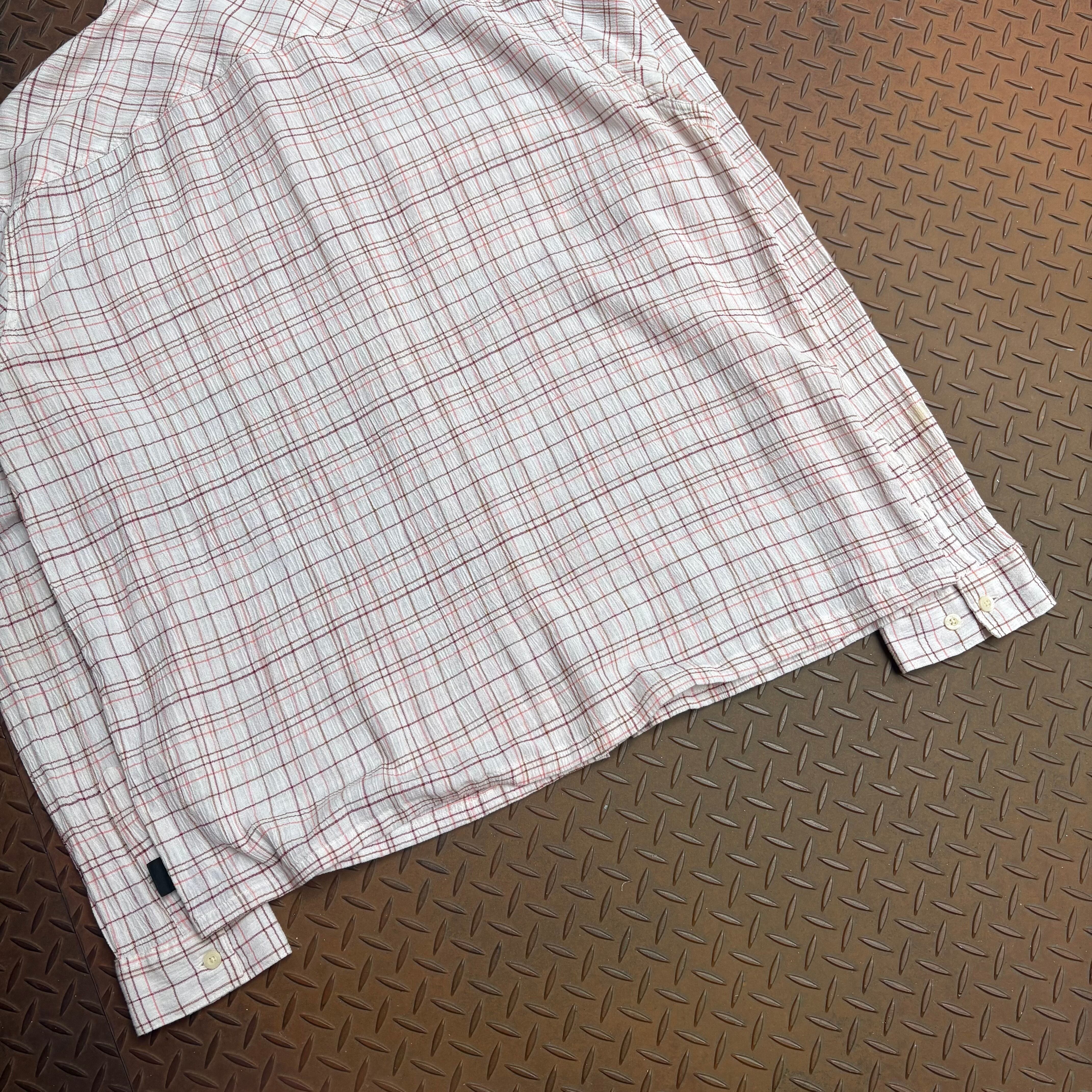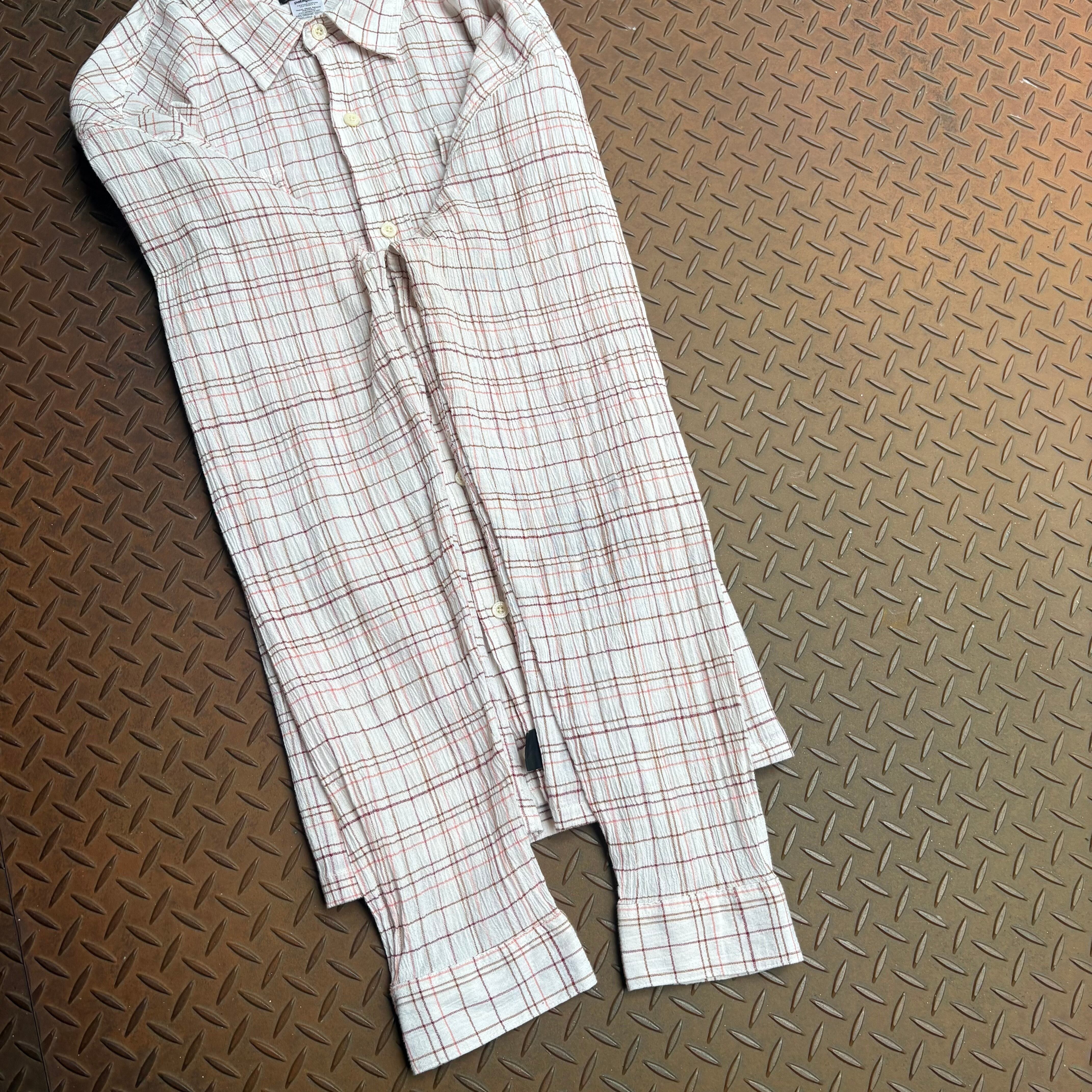 00年代のPatagoniaのチェックシャツになります。比較的近年ものの日本規格にはなりますが、そんなことは関係ないくらい、素材、デザイン、色味が秀逸です。オーガニックコットンが使用されており、縮絨加工のようなものが施され、シアサッカーのような軽い素材感になっています。デザインとしても、白ベースにブラウンとピンクの線で不規則なチャックが描かれていることから、50年代60年代頃のロカビリーっぽい雰囲気もあります。このデザインをパタゴニアがやっているというのが個人的にはテンションの上がる点でした。