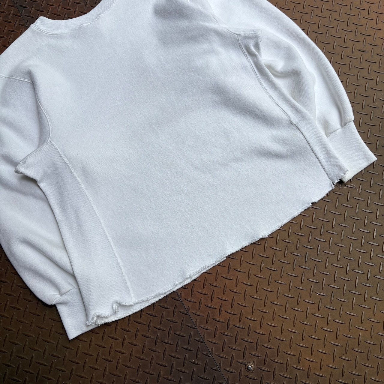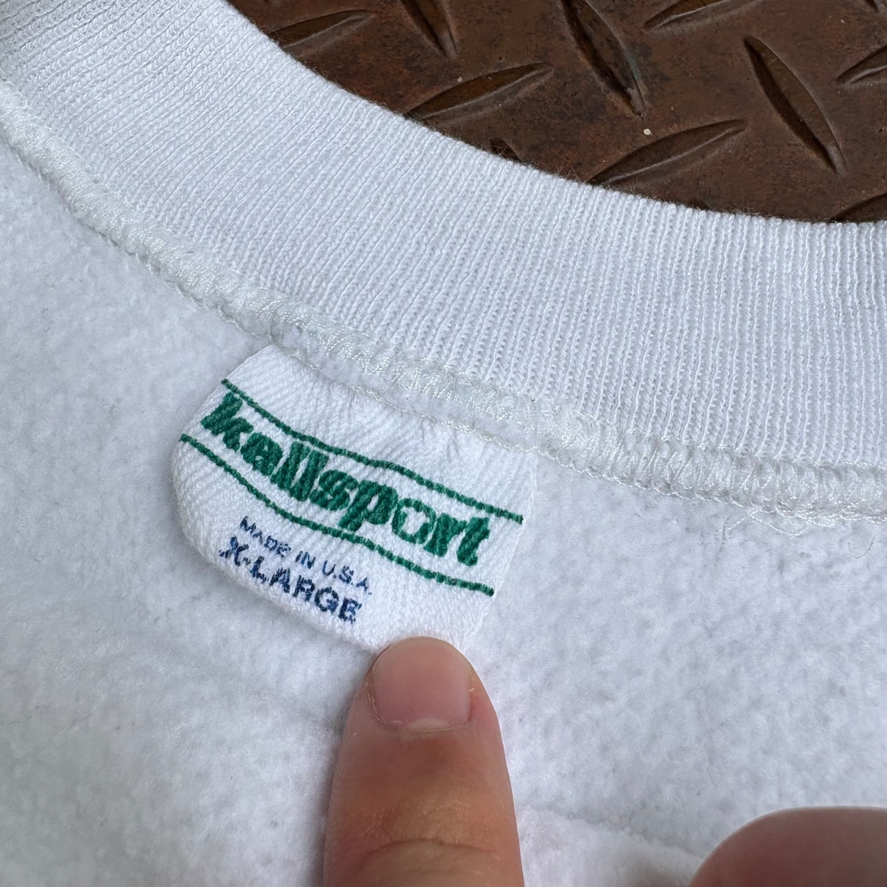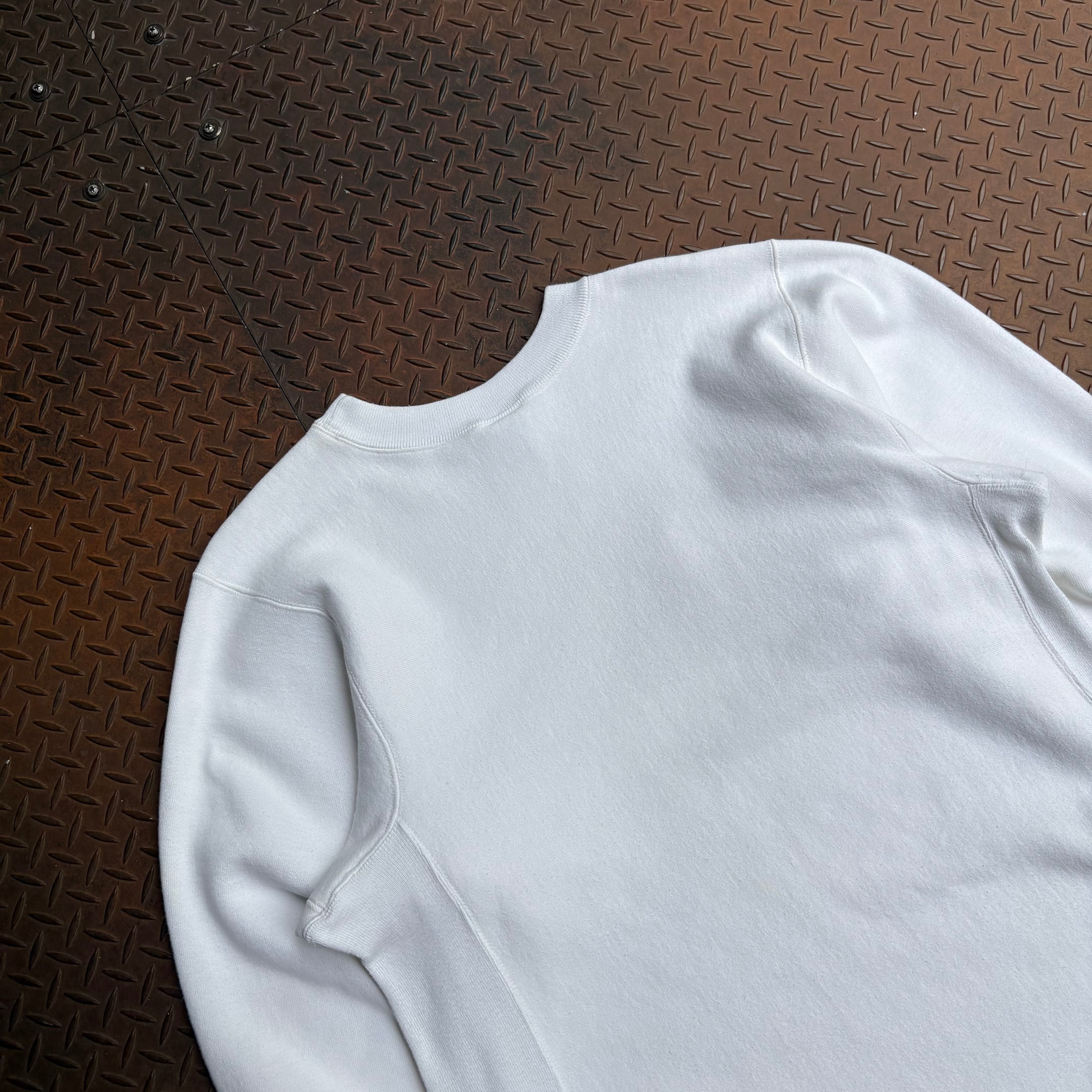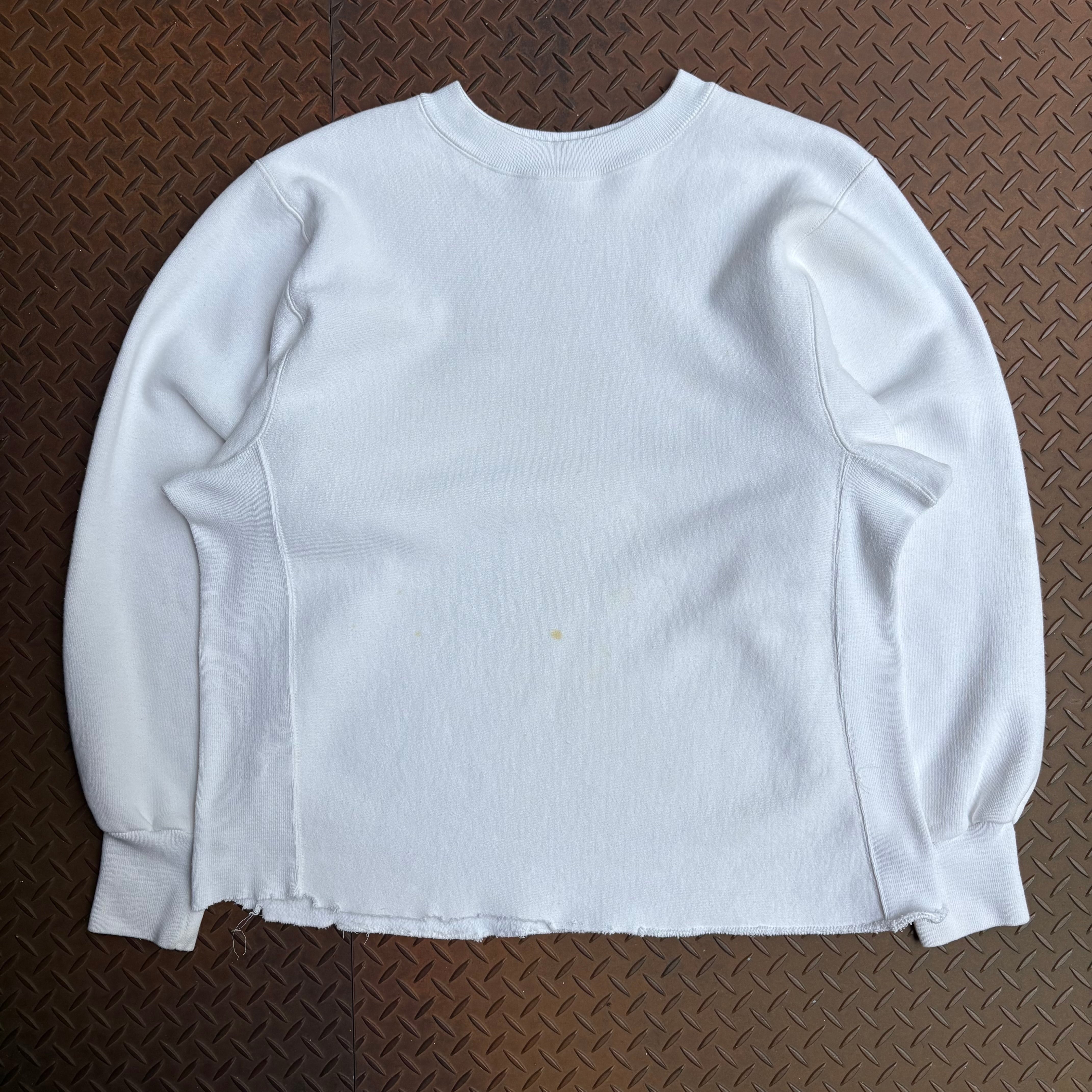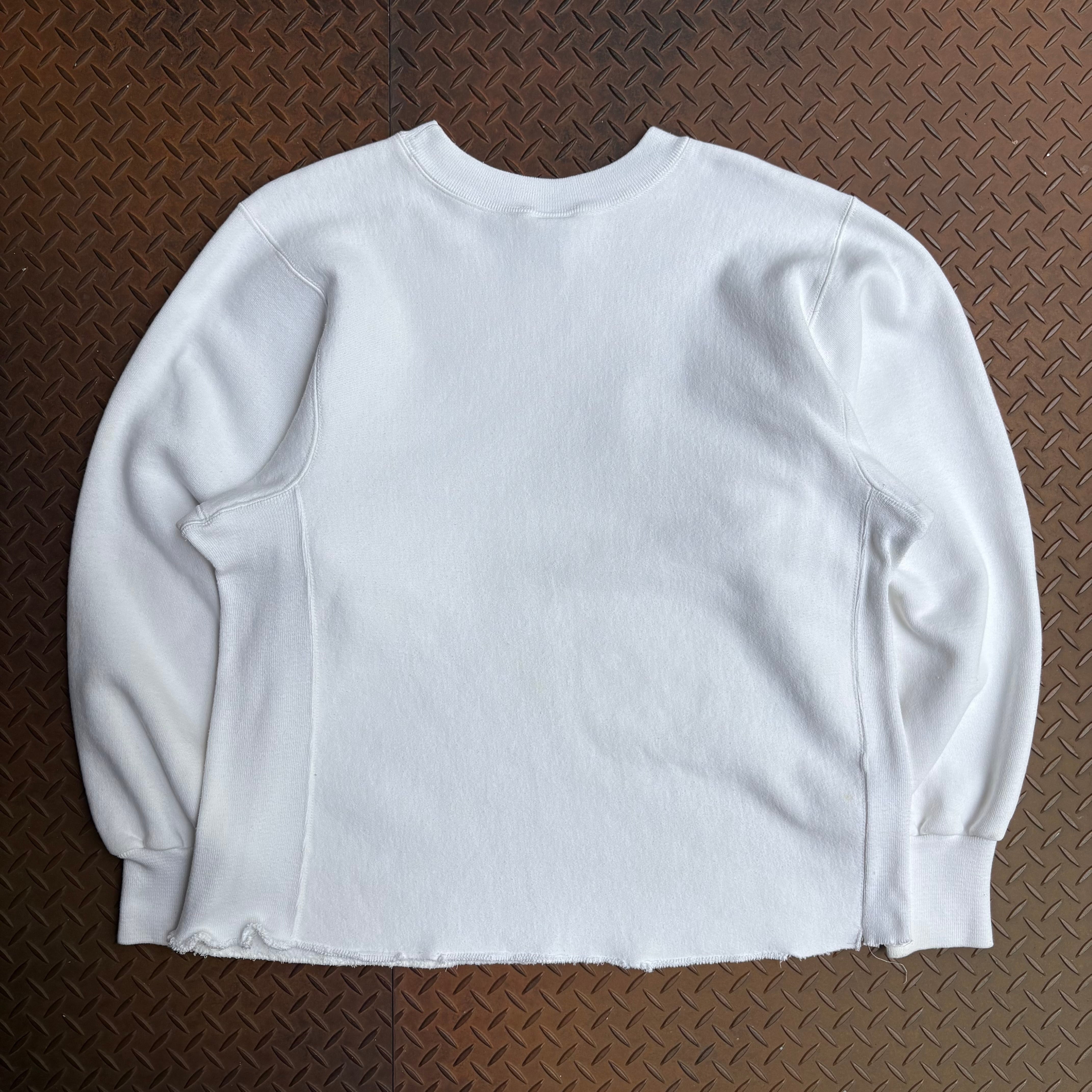 90年代頃のKELLSPORTのリバースウィーブタイプのスウェットになります。真っ白ボディで裾は全オーナーにカットされ雑なステッチングが施されています。カットオフによりリブがなくなったことで、ストンと落ちるようなシルエットになり、ヴィンテージのスウェットにはないすっきりとしたシルエットになります。ボディとしては、ケールスポーツなだけあって、かなり肉厚生地でしっかりしてます。天邪鬼な古着好きに是非手にとって欲しい一着です。