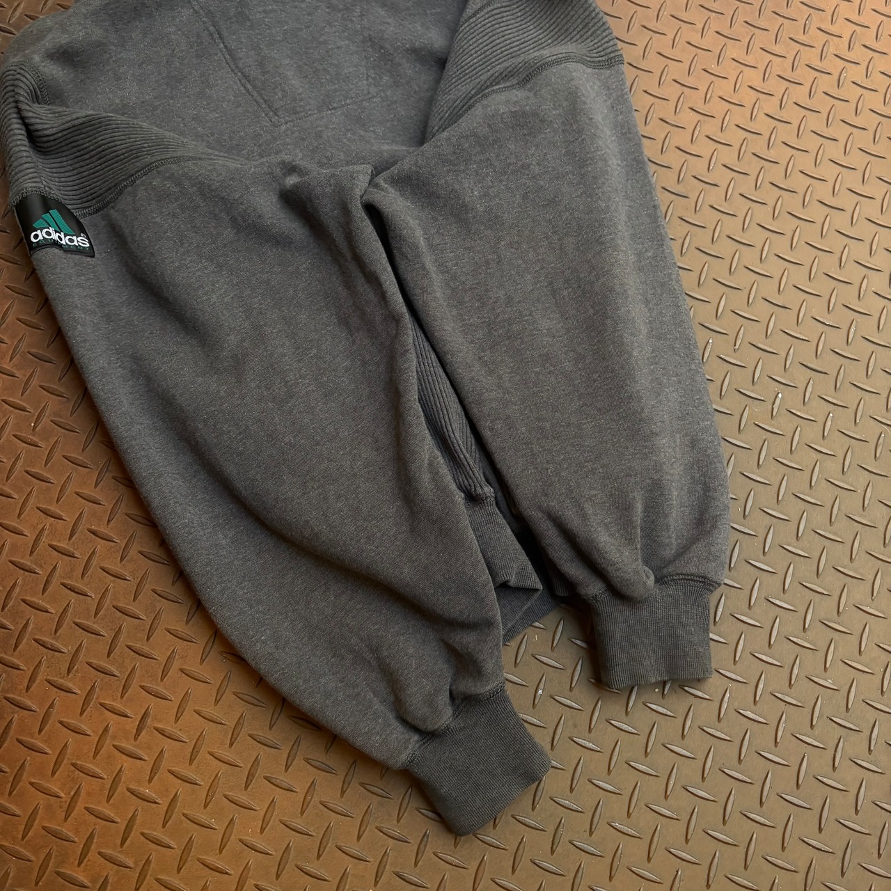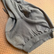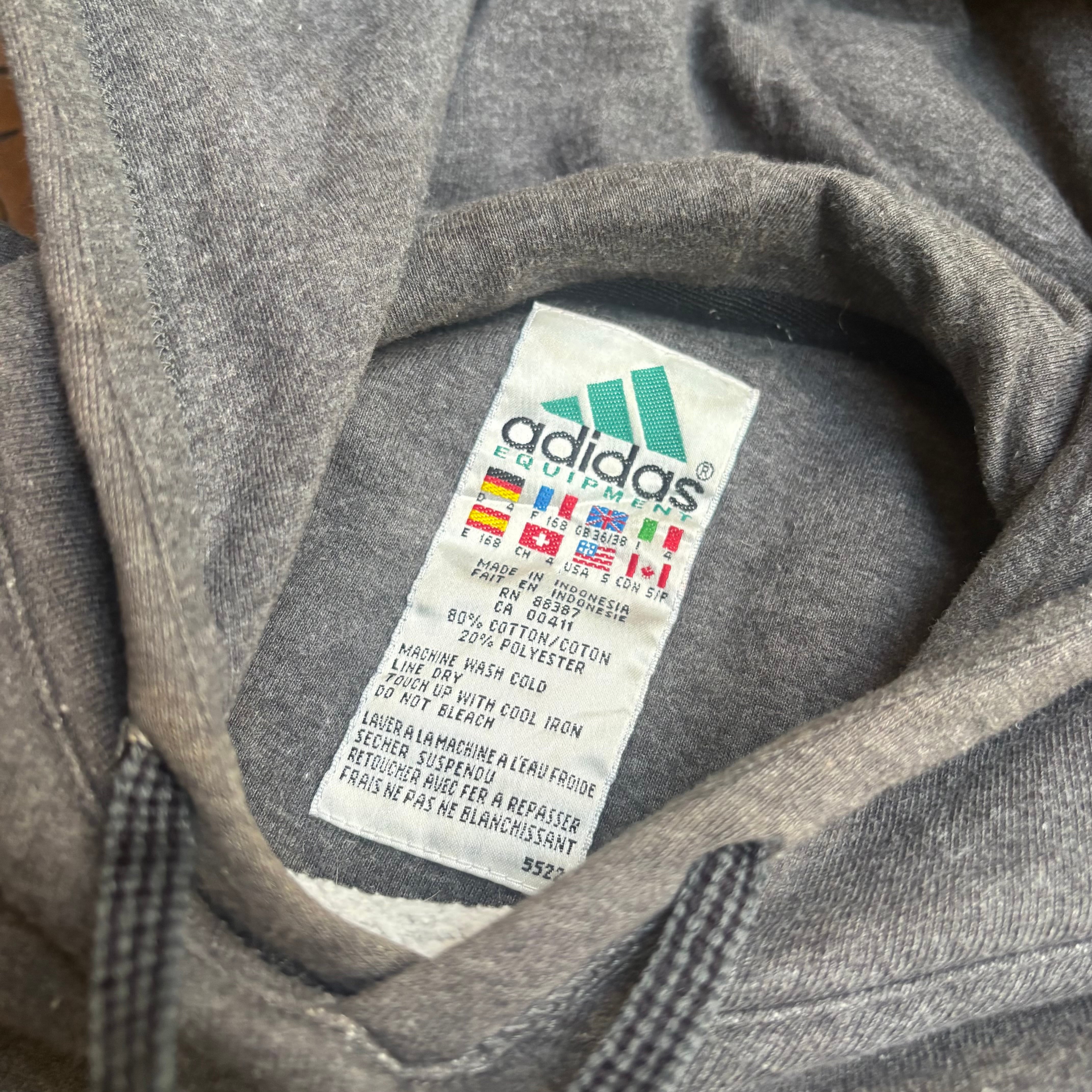90年代にできたADIDAS EQUIPMENTのラインのスウェットパーカーになります。こちらは初期のタグのもので90年代スポーツブランドのテックなノリが印象的です。緑のAdidasオリジナルロゴが特徴で、個人的にはAdidasでもっともデザイン性に優れているラインだと思っています。胴体脇部分をリブ切り替えにしてみたり、リブがきつめで着丈が上がるようになっていたり、身幅を広めに取っているといった、比較的近代的なデザインになっています。また、フードがガバッとかぶれる大きさに作られているのも、スウェットパーカー好き枯らしたらたまらないと思います。まだまだ古着市場でも知られていないコアなアイテムです、是非。