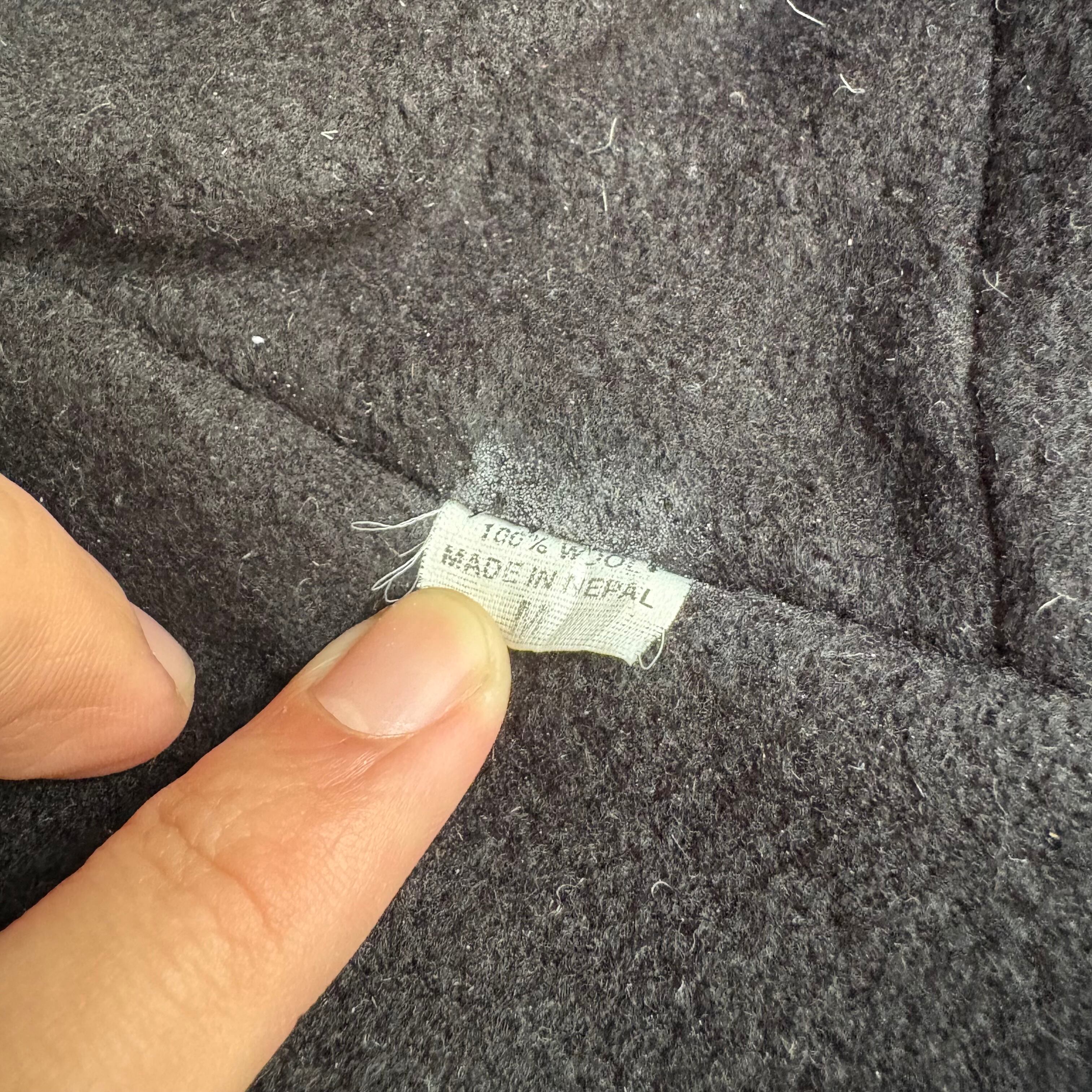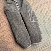 80年代から90年代のネパールニットになります。ネパールニットといえば、クルーネックやロールネックで星などのインパクトのあるデザインが多い中、こちらはジップアップフーディタイプのものになります。落ち着いたブラウンカラーで着やすく、裏地はフリース素材が貼られているため、ウールニット特有のチクチクもございません。また、袖にはMA-1サンプリングのシガレットポケットがついているとても乙なデザインです。っサイズ表記はございませんがLサイズくらいの大きめの作りで中に少々着込んでもごわつかないのでかなりオススメです。機能性やデザインで見ても珍しい作りの一着。お好きな方は是非。