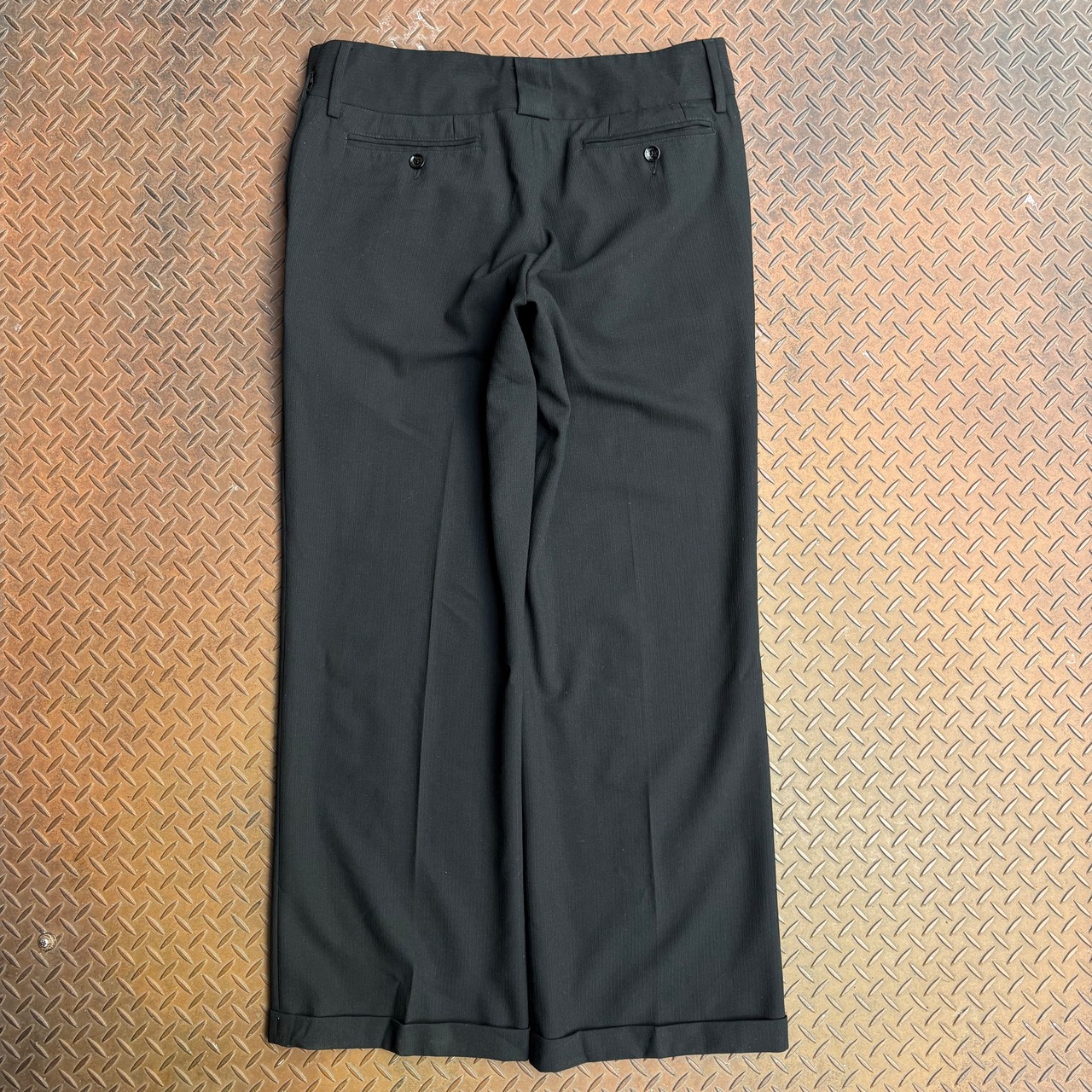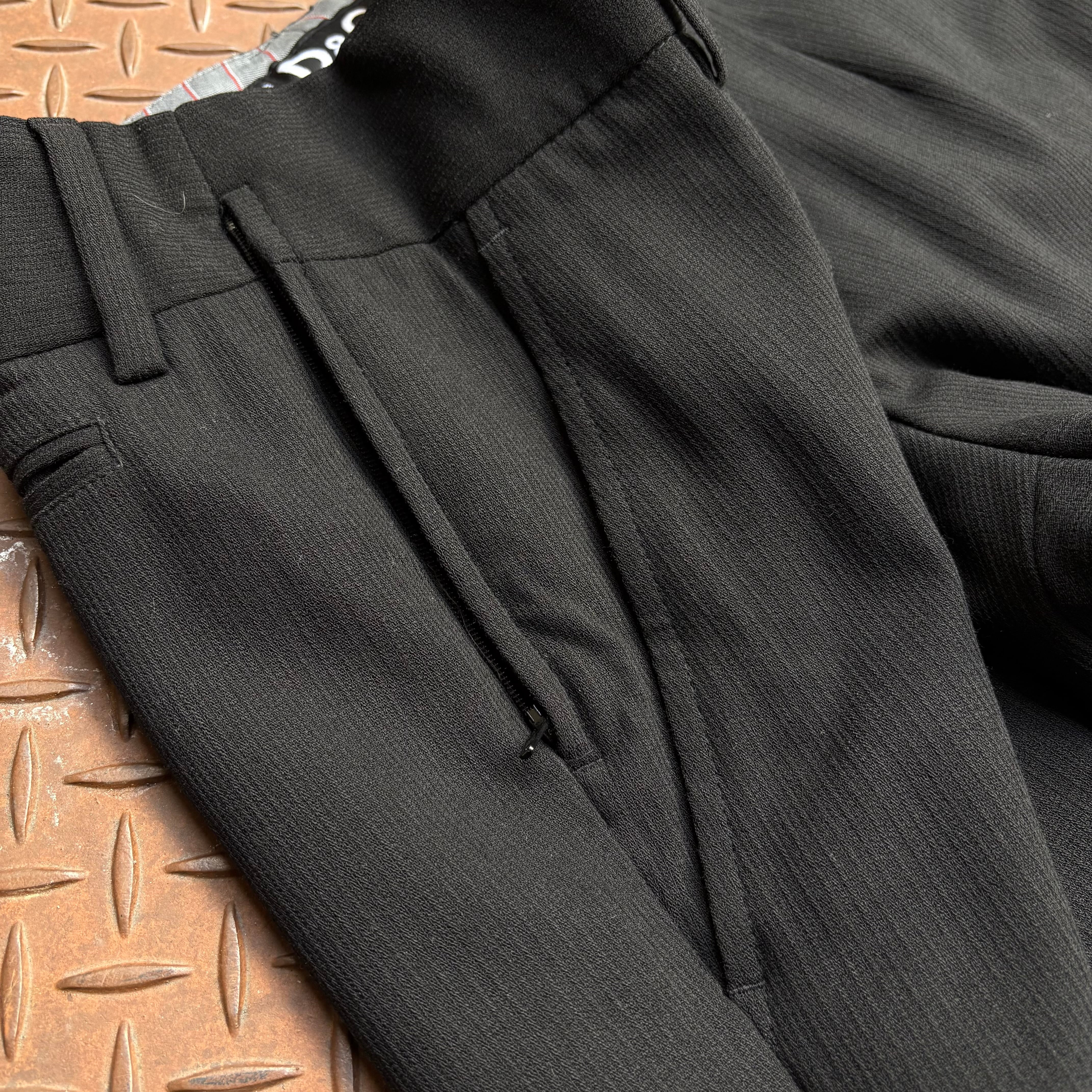 Dolce&Babbanaのポリウールスラックスになります。ワンタック仕様のストレートシルエット、凹凸でできたストライプデザインが輝く一着。ダブルの裾上げであることから、自重により立体感のあるシルエットが生まれ、かなり綺麗な装いに。デザイナーズブランドならではの粋な計らいとして、ポケット横にジップポケットが備わっており、利便性のある服としても評価できます。流行りのズドンとシルエットなだけでなく、ラグジュアリーブランドの持つエレガントさを感じられます。