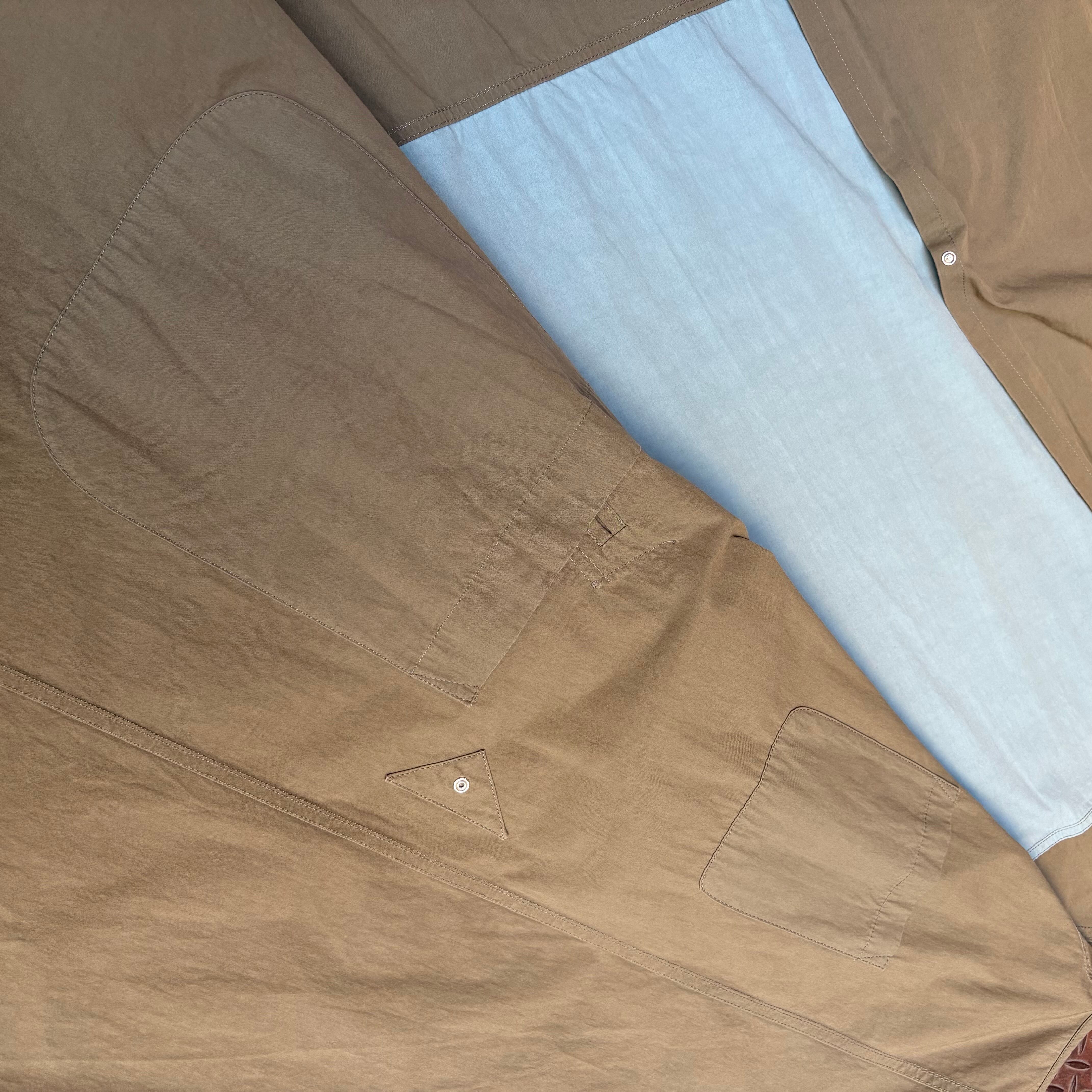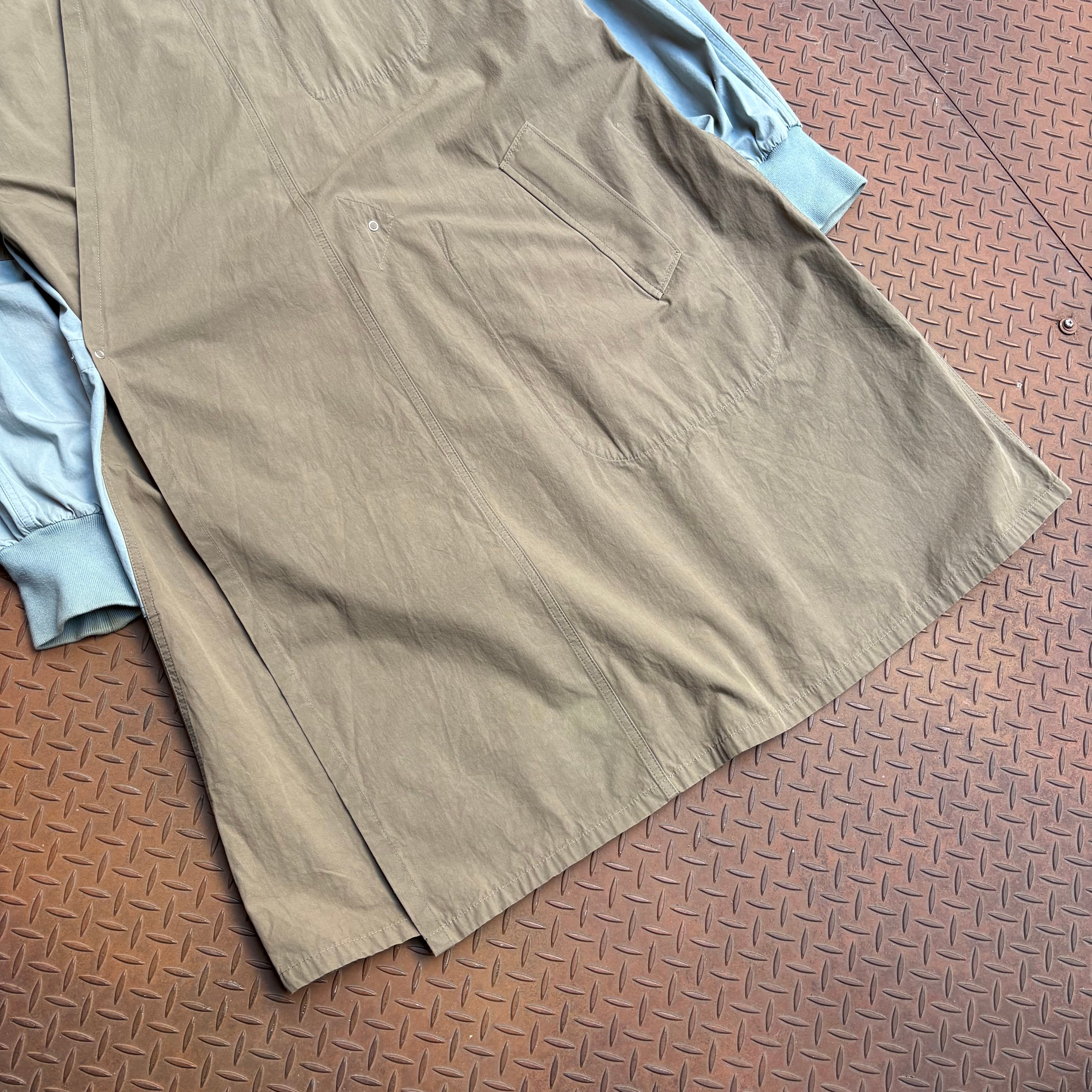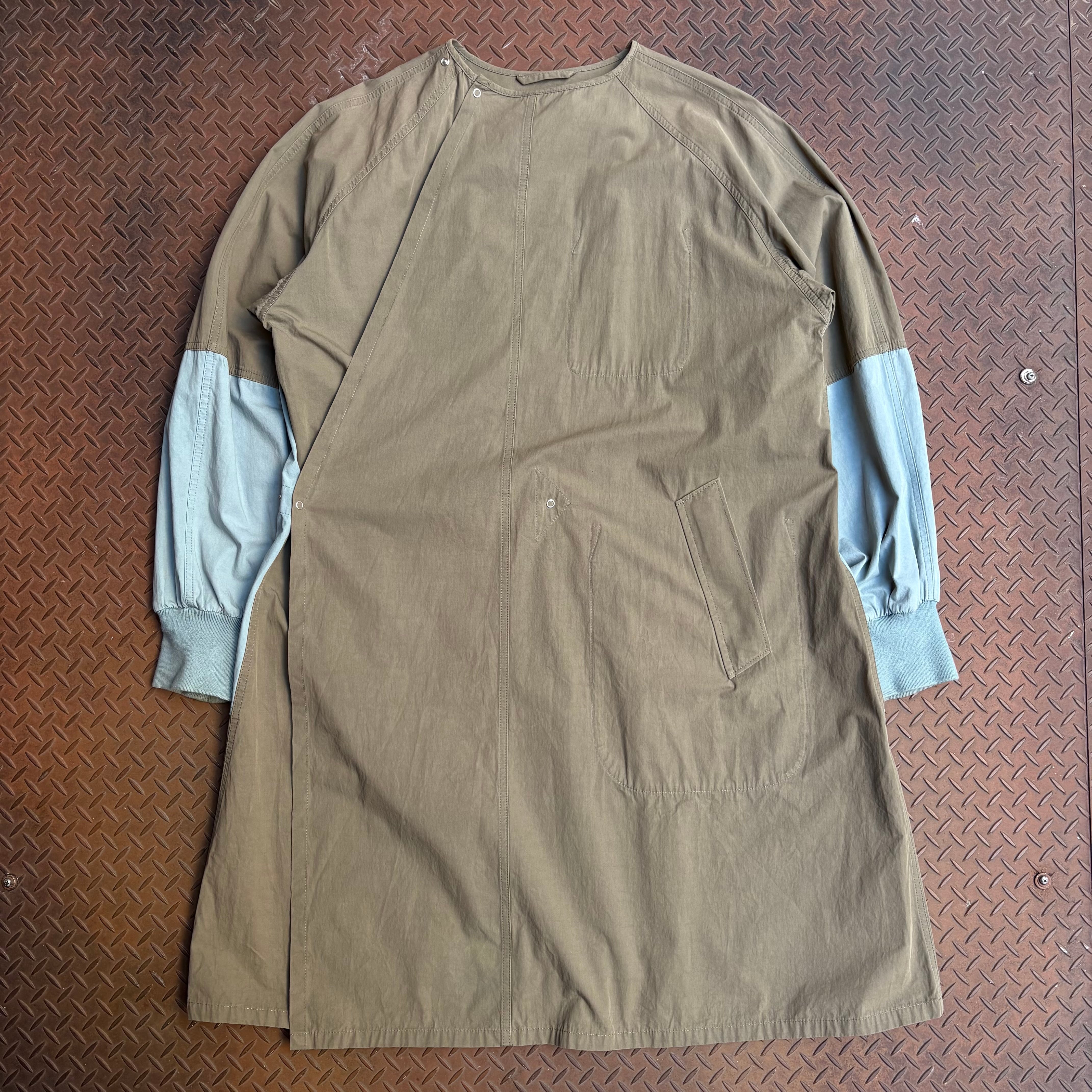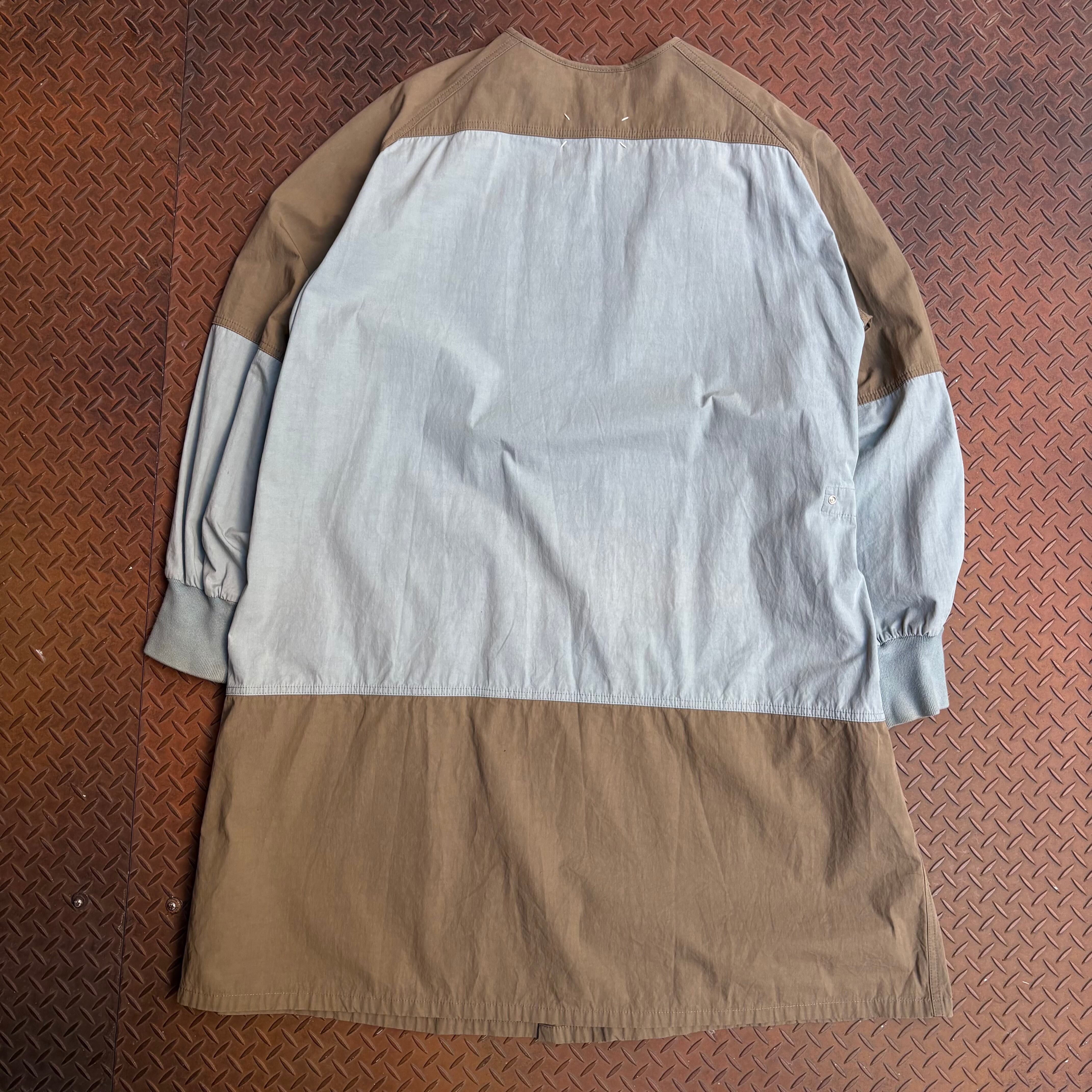 Maison Margielaのサージカルコートになります。2020AWで展開された一着で、ミリタリーの医療用コートからインスパイアを受けて作られたものだと思います。マルジェラらしい大胆なバイカラーのデザインとインサイドアウト。シームやポケットがインサイドアウトになっております。また生地がウォッシュドポプリンのコットンが使用され、長年着こんだようなナチュラルな風合いや、シワ感が出ております。ハリ感のある生地なので、ブランド自体のモード感のある服というよりカジュアルに振られたアイテムと言えるでしょう。ユニセックスで使えるアイテムでオススメです。