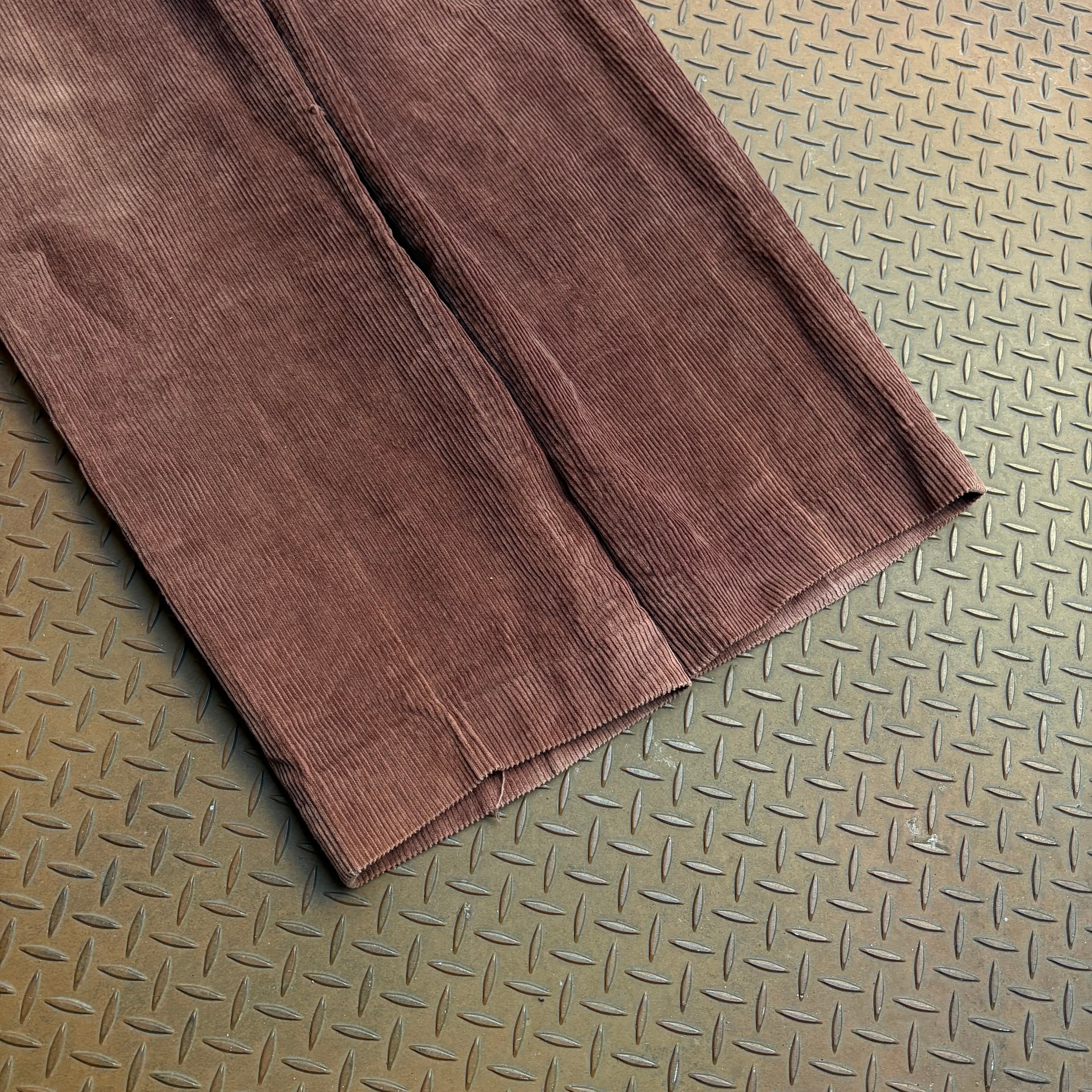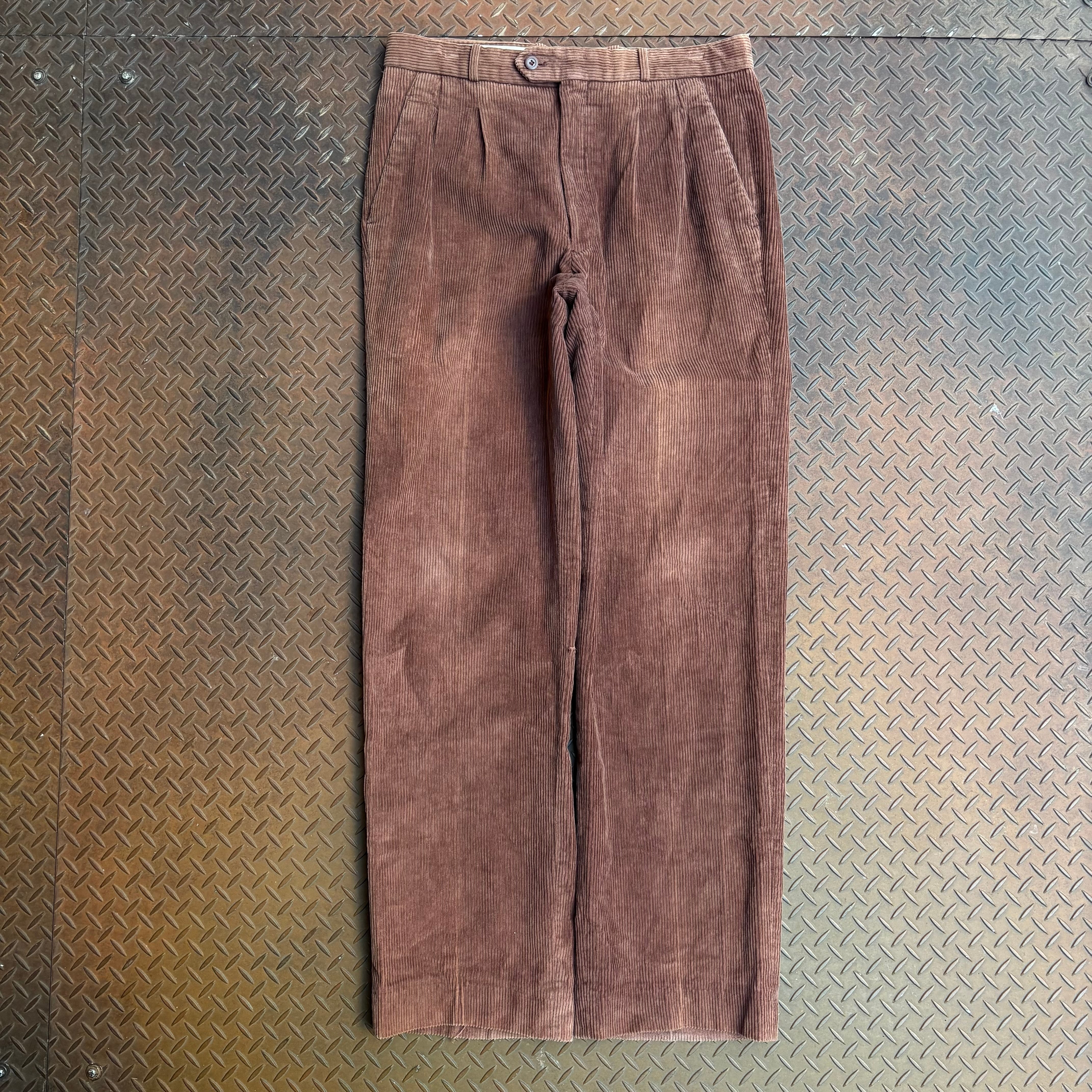 80年代から90年代頃のYves Saint Laurentのコーデュロイパンツになります。デザイナーらしくない古着な装いのアイテム。しかしながら、やや細身なストレートシルエットで2タック入りという点から上品さを感じます。コーデュロイのフェード感もむしろそのような加工に見えるほど大胆で、現行のデザイナーズブランドとの相性も良いでしょう。お好きな方は是非。