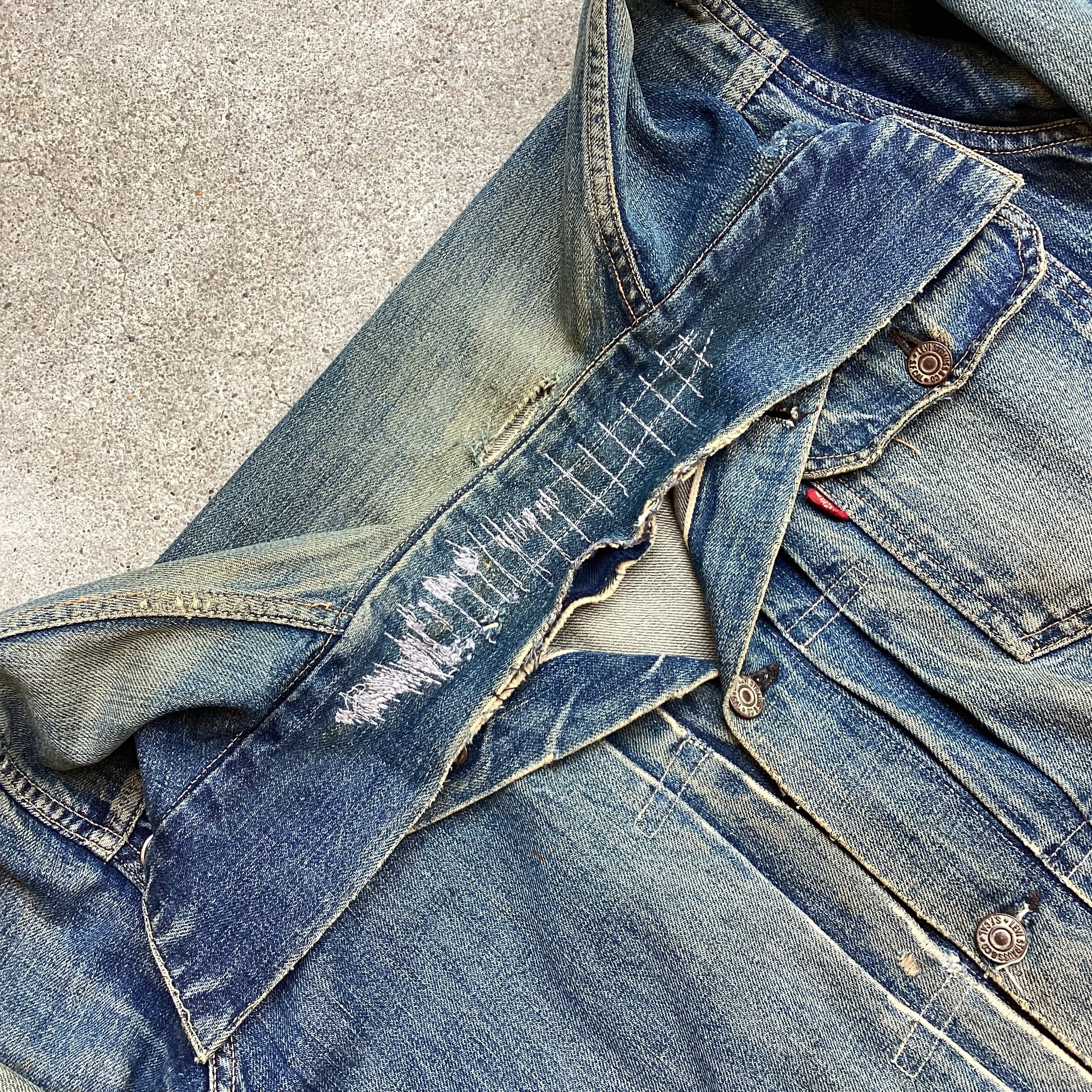 1947-52年頃のリーバイス、506XX、デニムジャケットになります。所以1st、説明不要です。身幅しっかりありますよ。着れるファーストです。雰囲気非常にええです。雑にデニムを貼ったリペアも適当感あって、なんかええです。これぐらいやれてないと昨今の高騰ぶりを見ていると着れたもんじゃないですよね。一応服なんで着たいです。相場よりは圧倒的にお買い求めやすい価格設定にしているつもりですので、ぜひトライしてみてください。袖のリペアの影響で袖先の着用感に少しゴワつきがあります。