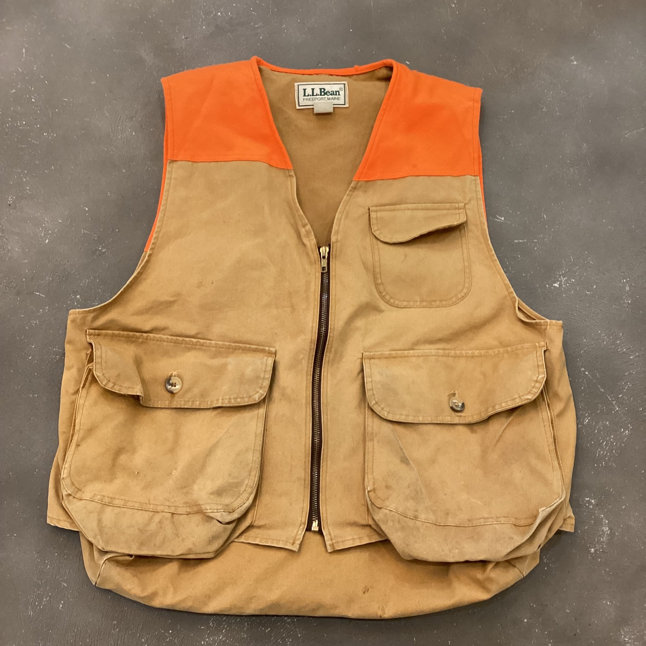 90年代頃のエルエルビーン、ダックハンティングベストになります。リアルに使われていた感半端ないですね。こういうのがええんです。加工じゃ出せないアジをこの値段で買えると思えば安いもんです。ただ、人それぞれですけどね。ブラウンダックに遭難、誤射予防のオレンジカラー。映えますね。お好きな方は是非。サイズ表記Lですが、