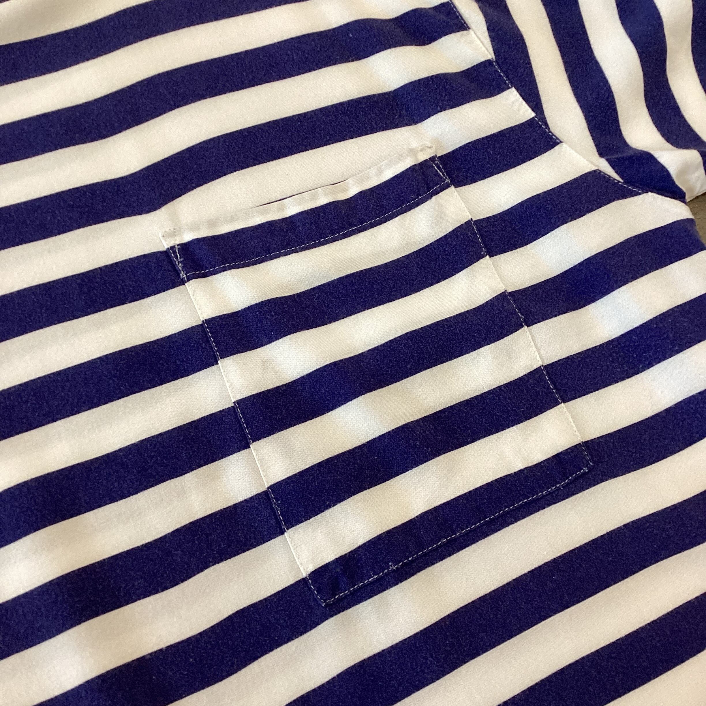 90年代頃のボーダーポケットTシャツになります。異様に大きいビッグポケットにネイビー×ホワイトの王道カラーリング。それでいて素材がなんとレーヨン、驚きますね。めちゃくちゃ着心地ええです。ナイスな古着です。グットレギュラー好きな方に是非。
