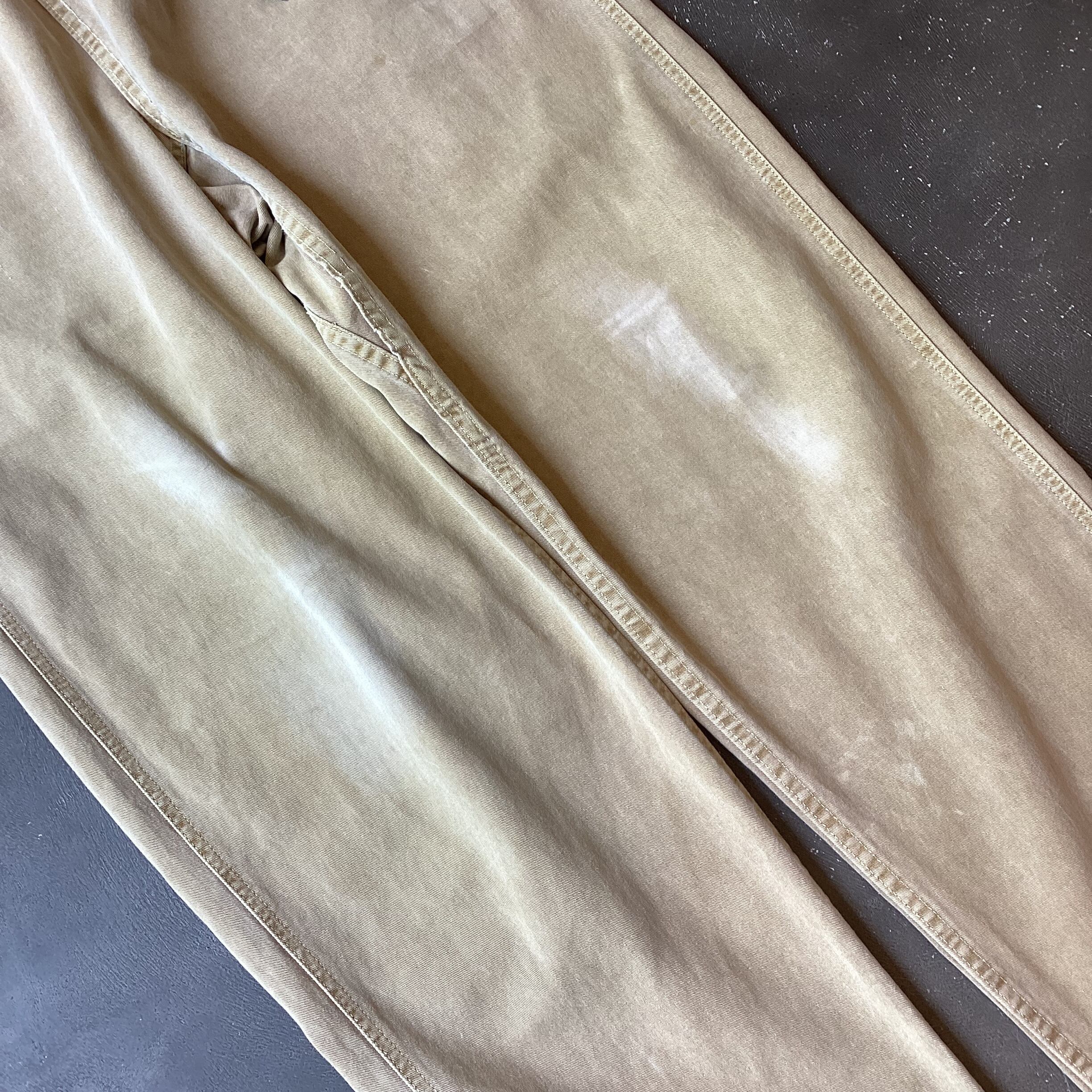 90年代後半からの最終USA製、リングスパンコットンという少し珍しい素材感。ツルッとしていて非常に着用感が気持ち良いですね。程よくやれたベージュがまた良いですね。グラミチの概要としましてはロッククライマー、フリークライマーのマイクグラハムが82年にヨセミテで創業。クライミングの際に開脚を180度可能にするガゼットクロッチ、片手でウエストサイズを調整できるウェビングベルトが搭載された機能性抜群のクライミングパンツが当時のクライマーに人気を博し、今ではファッションとして定着していますね。USA製はかなり貴重なものになってきました。お好きな方は是非。