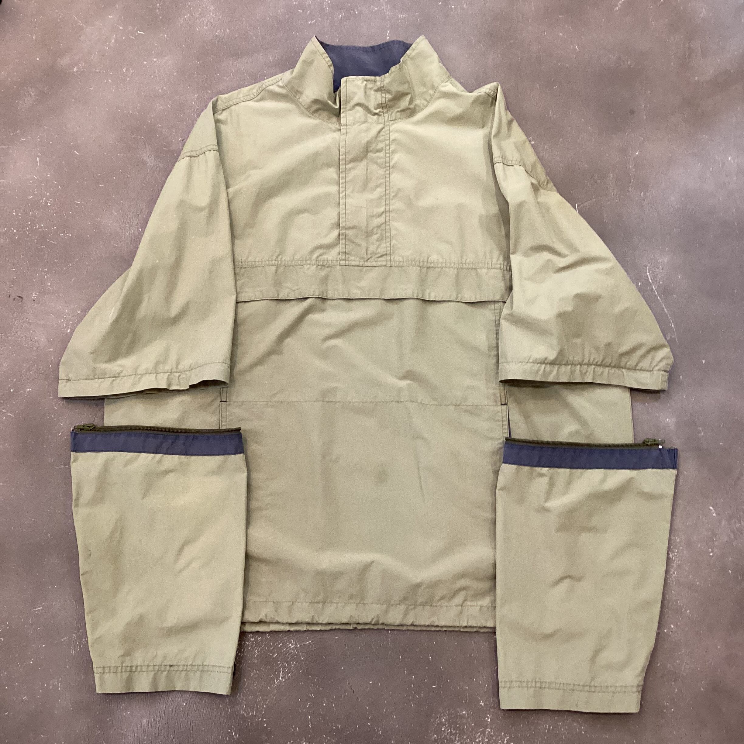 総じて作りが良すぎるアノラック。まずは素材なんですが、ヴィンテージアウトドアをしっかりと踏襲した65/35のコットンナイロンを採用。普通やと60/40のコットンポリで作るんやと思うんです、この感じやと。でもあえてナイロンにして、摩耗性に強かったり、伸び感があったりするものをアイテム的に好んだのでしょう。ほんまに昔のギャップ然りオールドネイビー然り、ええものづくりしてるんですよね。今はファストのくくりですけど、当時ってそこまでファスト寄りではなかったですからね。お値段もそこそこしたはずです。プラス袖ポケット、袖も取り外しができ、半袖のプルオーバーにもなるってやりすぎですよね。今のオールドネイビーじゃ全くあり得ない作りですから。古着で探しましょう。ええもんあります。