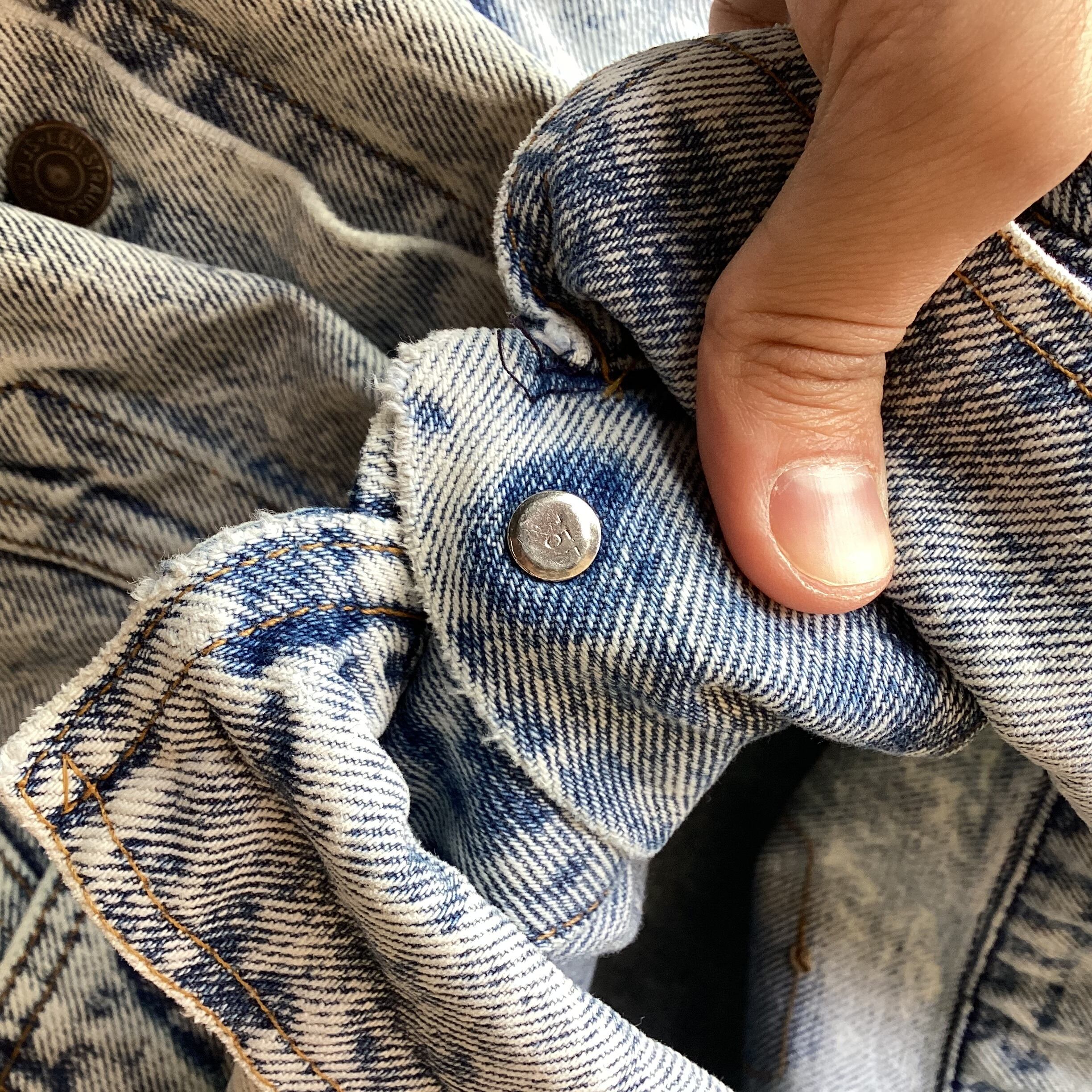 なんだか今年はケミカルウォッシュを着たい気分です。この辺の変態系も見かけなくなった印象です。やっぱり古着は一点モノが良いですよね。この辺が好きな人は恐らく古着らしい古着が好きな方なのかなと思います。完全ボックスシルエットでおさまりが良いのはもちろんなんですが、ケミカルウォッシュで十分ぐらい利いているデザインをさらにバックでも発揮してきます。レザーパッチもこんなとこにつけるんですね。ボタン裏刻印755でUSA製というところもなかなかイレギュラーです。こういうデザイン利いたやつはこの工場やったりするのかなと思ったり。あと白タブのリーバイスの色もネイビーなんですよね。色々レアいです。