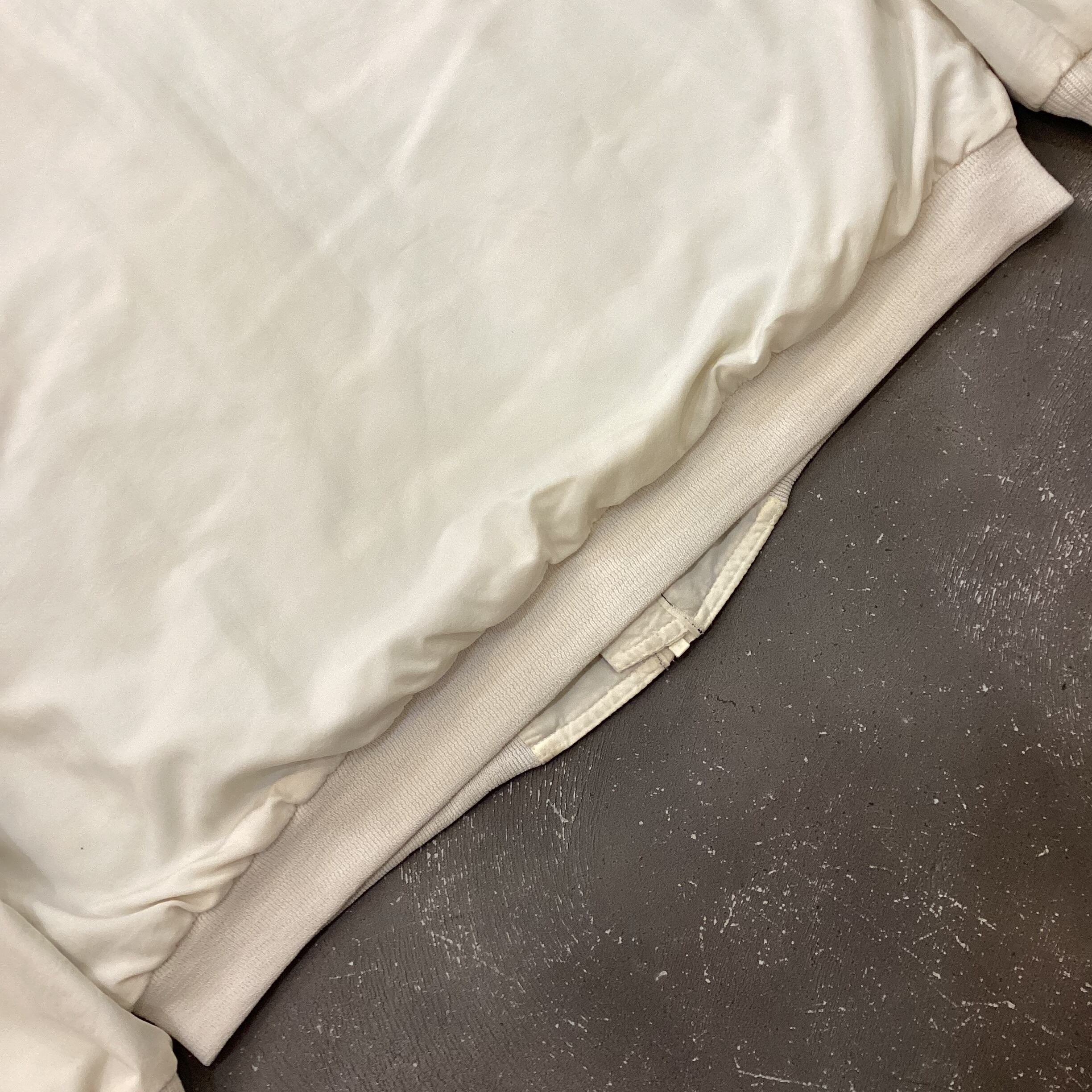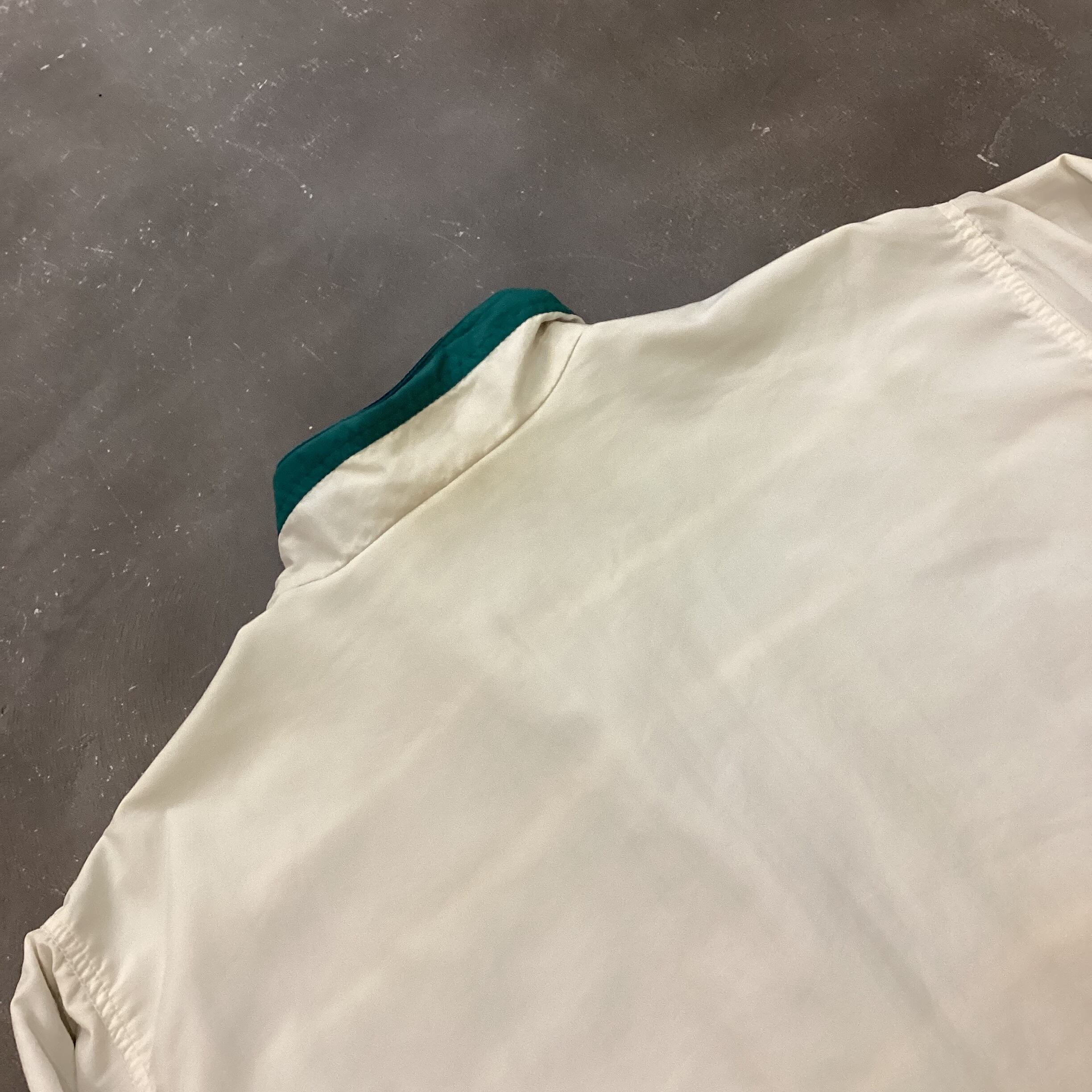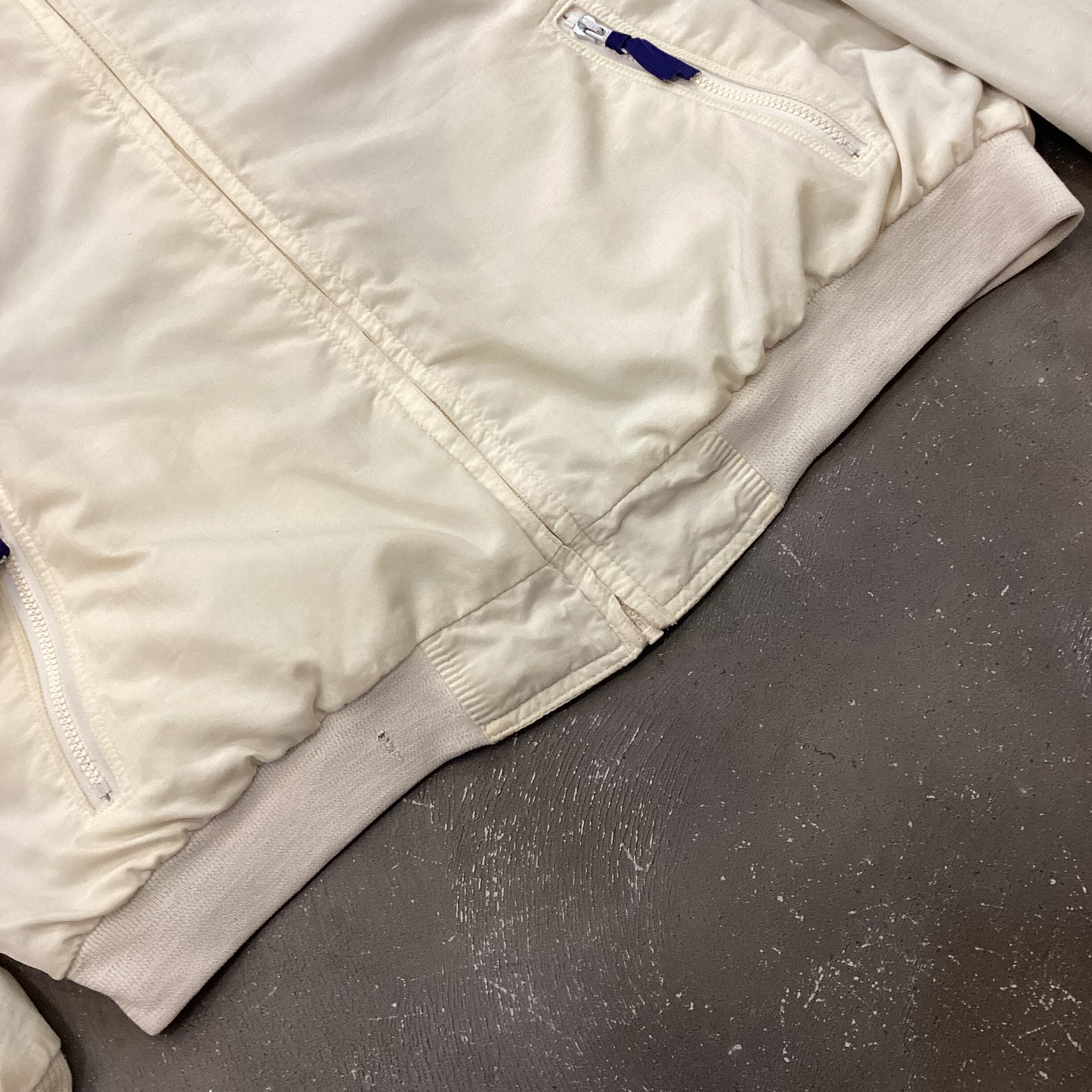結構レアいと思います。アウトシェルは至って普通なロゴが配されたブルゾンなんですがここからちゃんと色々目を向けるとないんじゃないかなと思うようになってきます。まずは襟の先端だけで緑カラーになっている、あとよくよく考えてみるとこのボディ自体のクリームっぽい色味もブルゾンで考えるとそこまで数多くないなと思います。そして極めつけはインナーフリースライナーの柄、カラフルな寒色メインのランダムボーダー、スペシャルでしょう。これでサイズXL、デカすぎない長方形ボックスシルエットにちょっと嬉しいUSA製。いうことなしです。