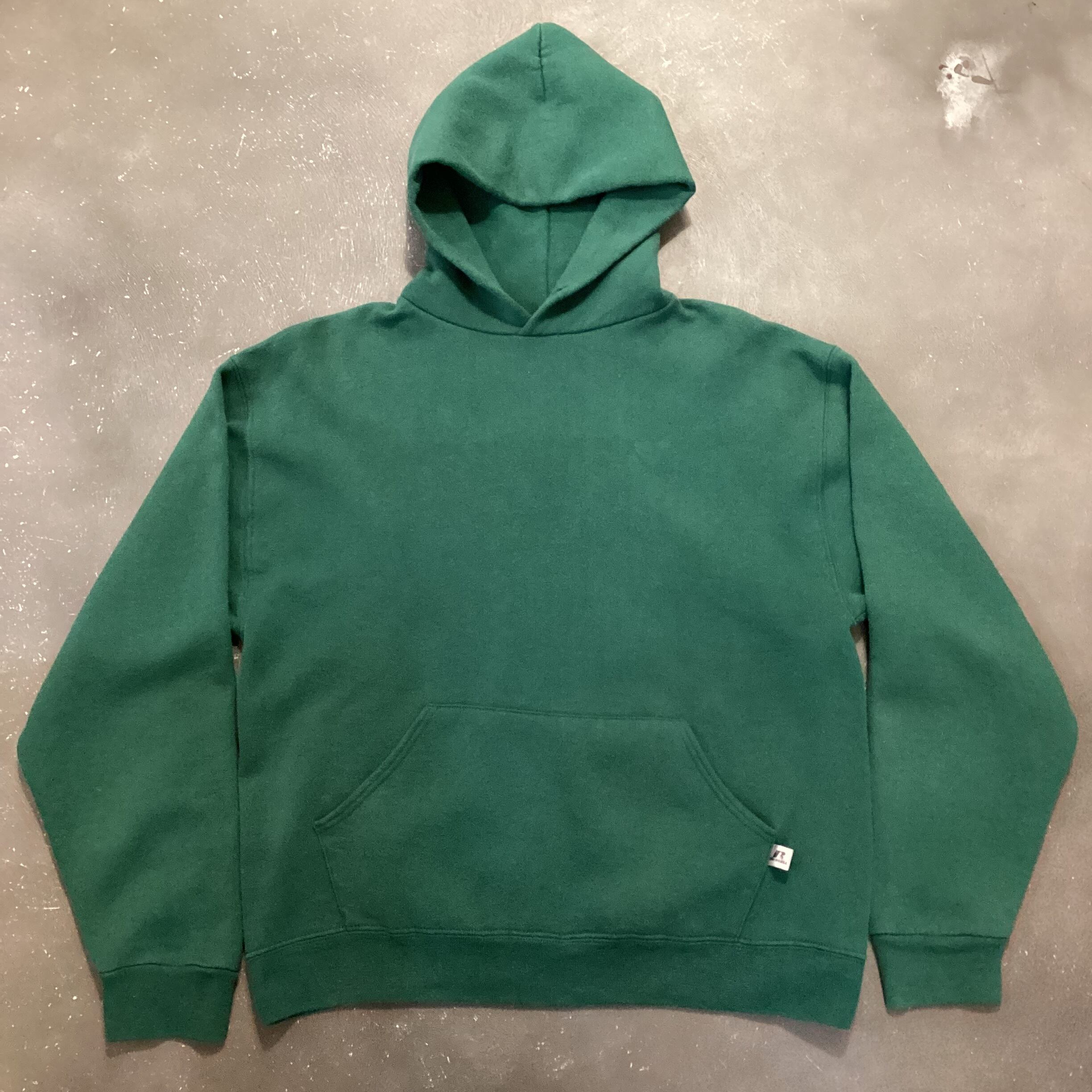 タグ飛んでますが、90年代後半から00年代頃のラッセルアスレティック、スウェットフーディーになりまし。素材はこちらも触感でしかないですが、コットンポリの50/50やと思います。結構使っていたのか、やたらモチモチになってて着る分には逆に気持ちいいしええ感じに仕上がっております。なにせこの色味ですよね。ええグリーンです。サイズ表記不明ですが、多分表記はMやと思うんですが、着てくうちに伸びてL程度になってます。身幅も60超えてますし、ほとんどボックスシルエットで今っぽく着用できると思います。