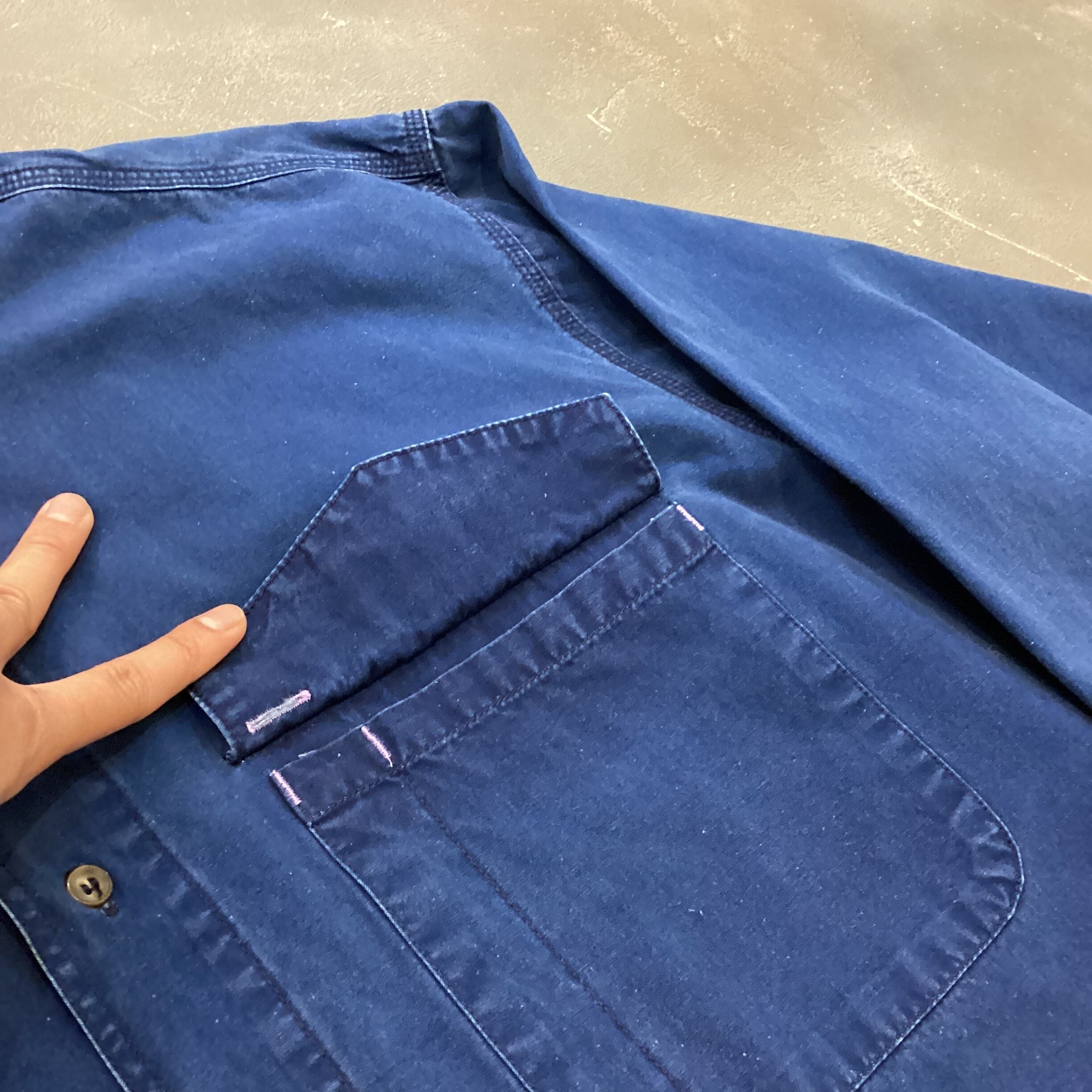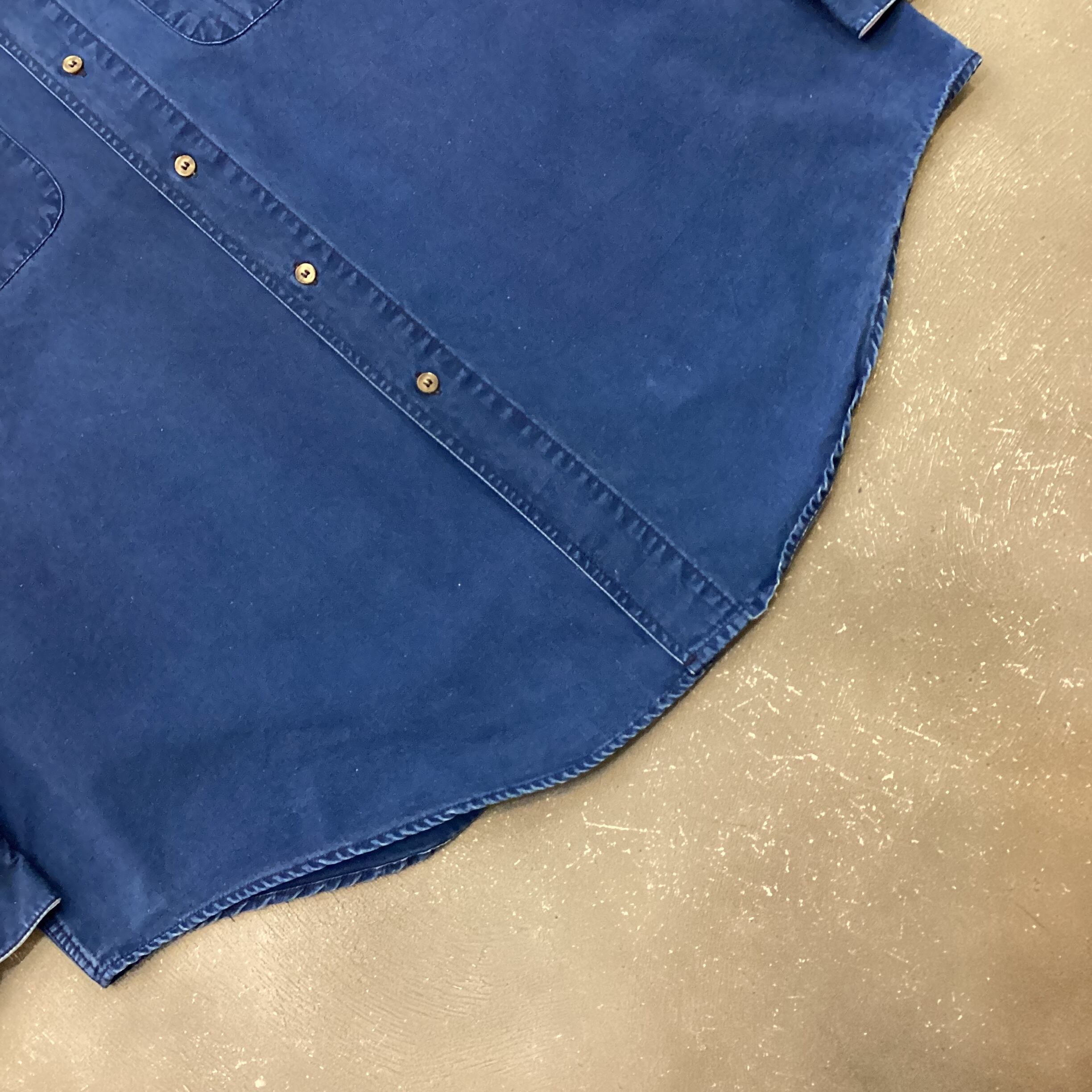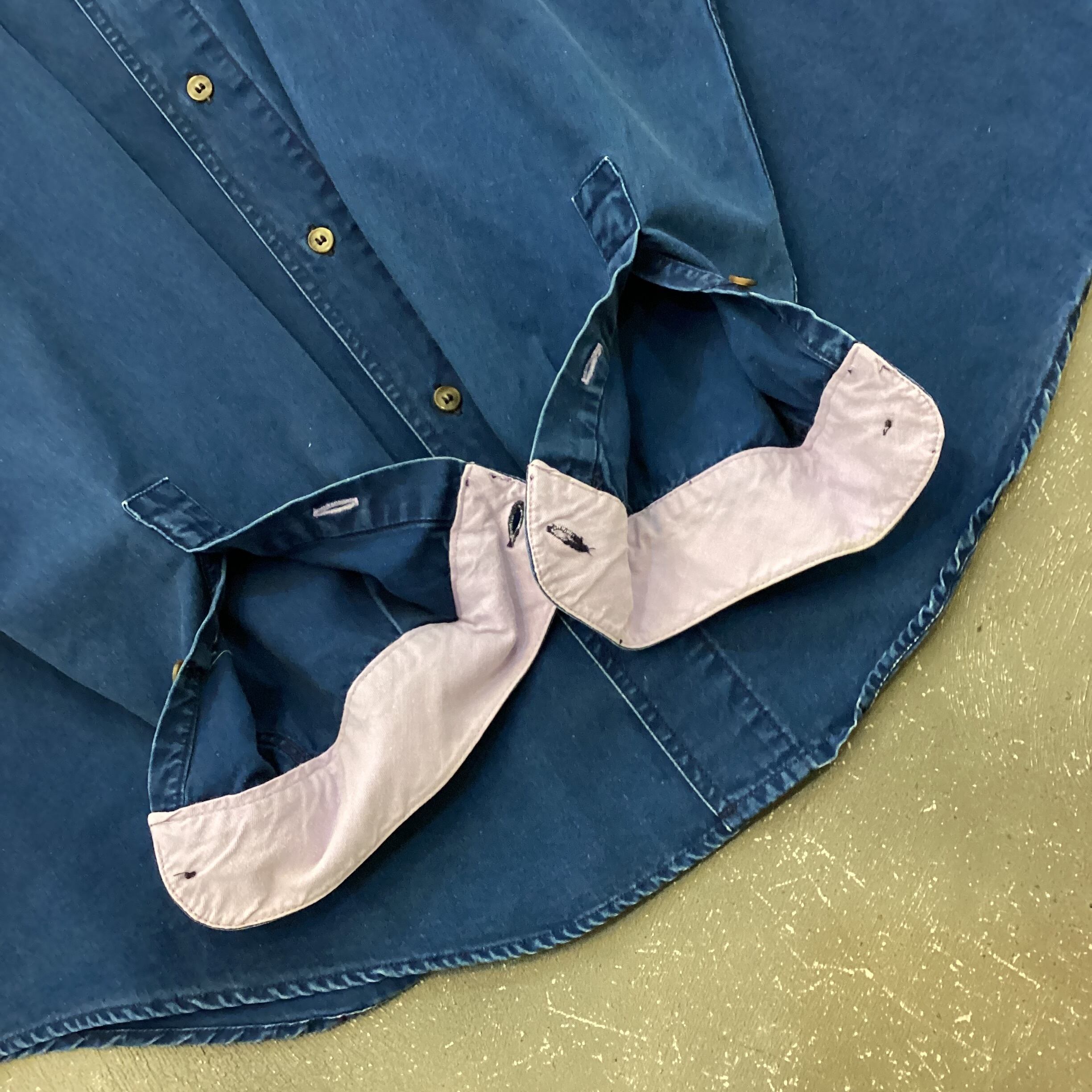 少し変わったパタゴニアのシャツ。袖とタグがついている部分ラベンダー色になっており、若干2トーンカラーになっており、だいぶオシャレに仕上がっております。ボディもおそらくインディゴ染めされており、裾、袖、襟の先辺りは良い感じのアタリがすで出ていますね。ワークシャツ仕様でペン差しなんかもついてます。さすがはパタゴニア、よくできてます。サイズ表記Lですが実寸XL程度ございます。