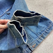 ワンスアポンアタイムインハリウッドでブラピが着用していたデニムジャケットのボタンタイプ、24MJZの後継種、124MJですね。ラングラー特有のこの落ち感が個人的には好きです。70年代頃から初めてラングラーが綾を左や右にするのではなくまっすぐにしたんですが、その影響で経年変化でどっちかに生地が歪んでいくのがなくなったんですよね。画期的な発明やと思います。唯一デザイナーを入れてデニムをファッショナブルなモノにしたのもラングラーが初めてですしね。なんだかリーバイス、リーよりも惹かれませんか?お好きな方は是非。サイズもしっかり40と比較的大きめです。雰囲気も良いですよ。