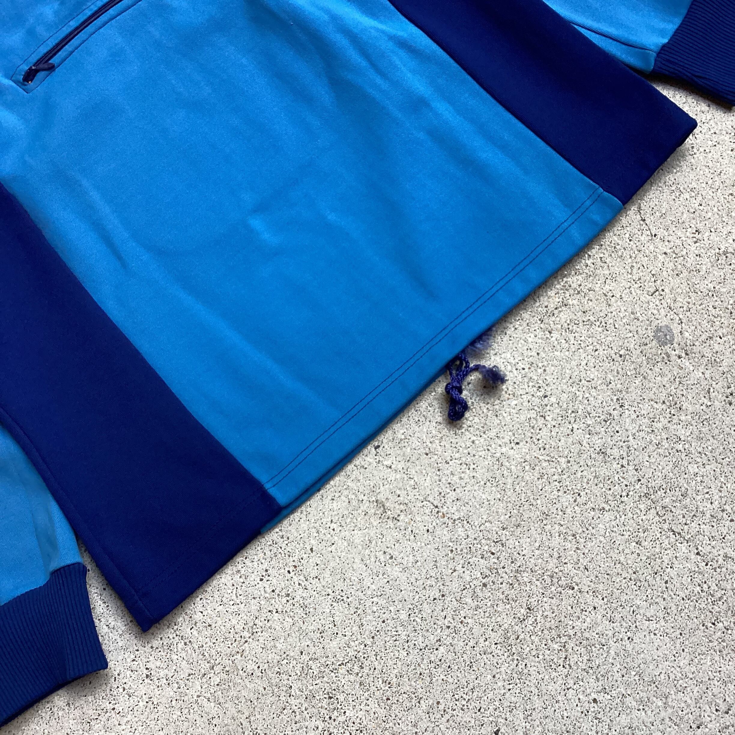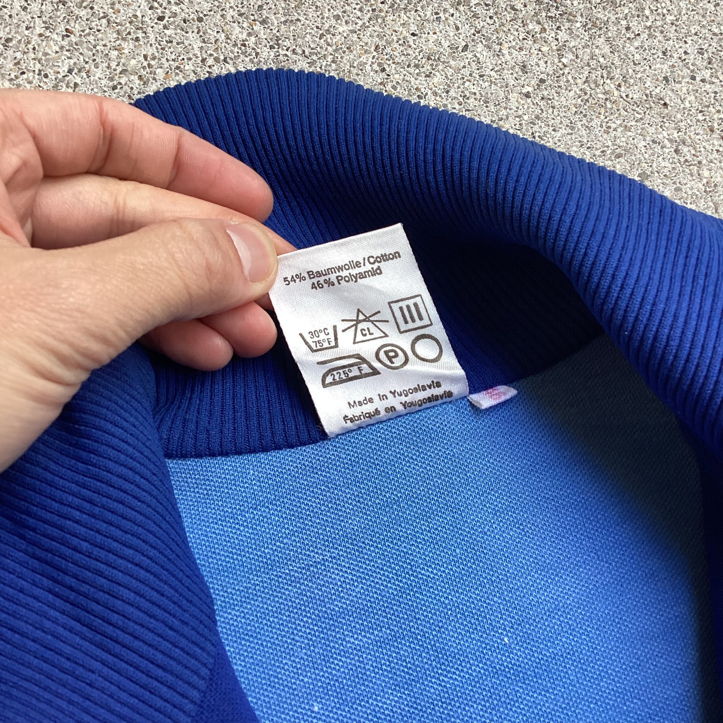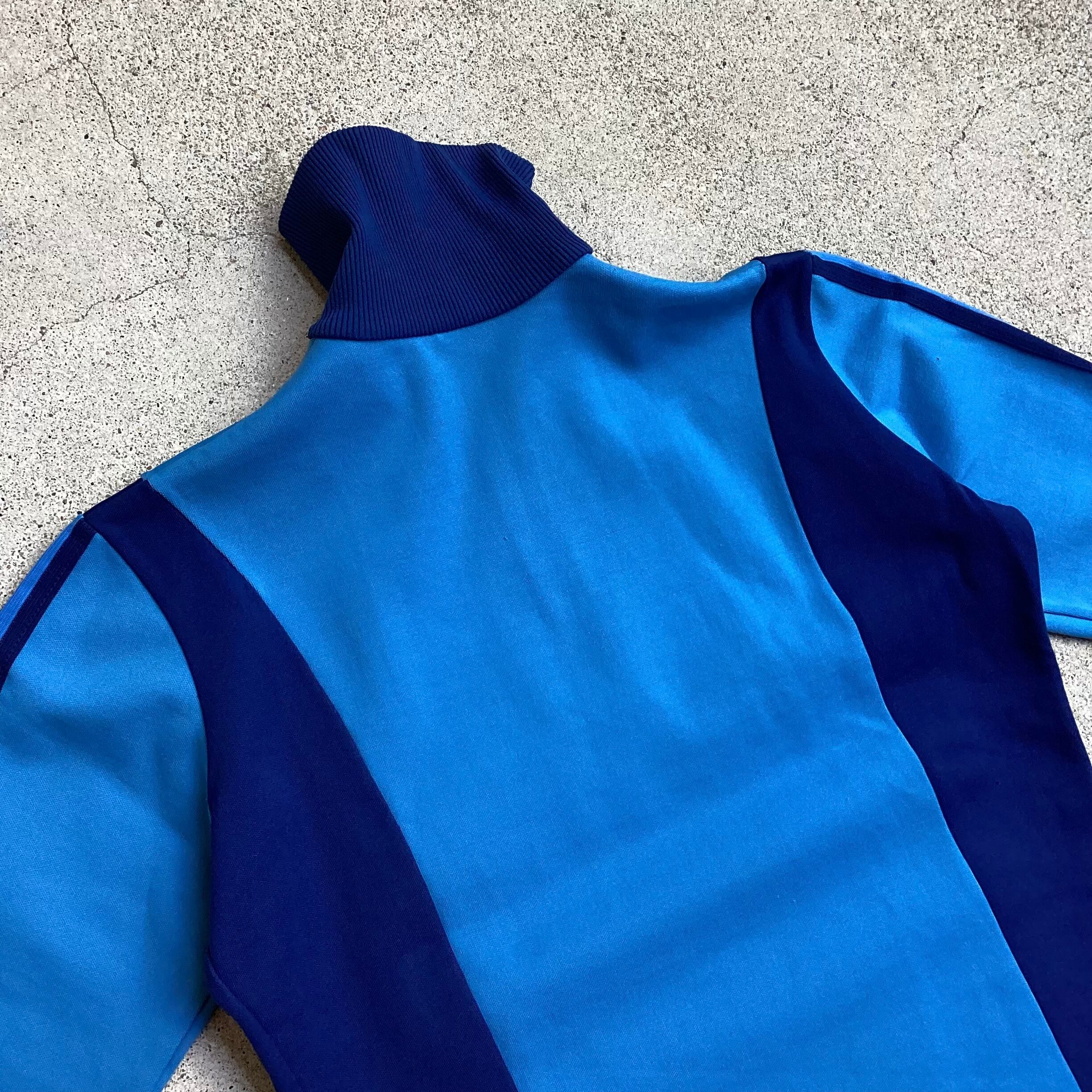 初見も初見、プルオーバータイプのジャージートップス、色も2トーン、ハイネック仕様、コットンとポリアミドという素材混紡も珍しい気がします。サイドポケットはなしでフロントのドラえもんポケットみたいなやつのみという、いつ使うねんみたいなポケット。こういうのが面白いんですよね。しっかりユーゴスラビア製、これ女性が着てたら痺れます。サイズ表記46、実寸M程度。ピッタリ目にきちゃってください。サイズ合う方には強くお勧めしたい1着です。