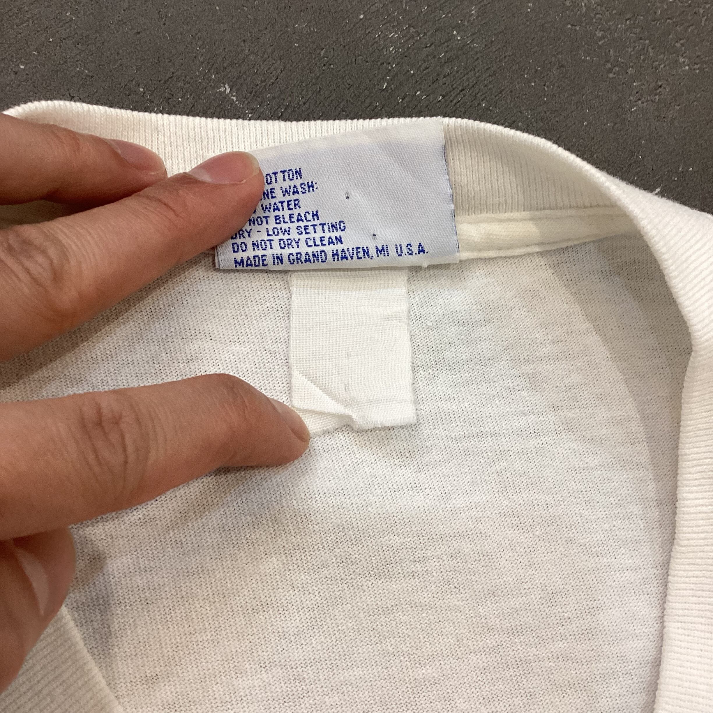 80年代頃のミシガンラグ、プリントTシャツになります。85年創業なのでかなり初期の頃のモノですね。実物は初めて見ましたがやはりあるんですね。球数はジャケットなんかに比べると圧倒的に少ないと思います。柄はよく見る鳥がいっぱいの総柄プリント。1枚でもかなりインパクトありますよね。これからどんどん薄着になっていくのでこれぐらいパンチ効いたTシャツあったらスタイリングが非常に軽快に進むと思いますよ。丸胴ボディ、シングル、ダブルステッチ。良いTシャツです。サイズもしっかり実寸L程度ございます。