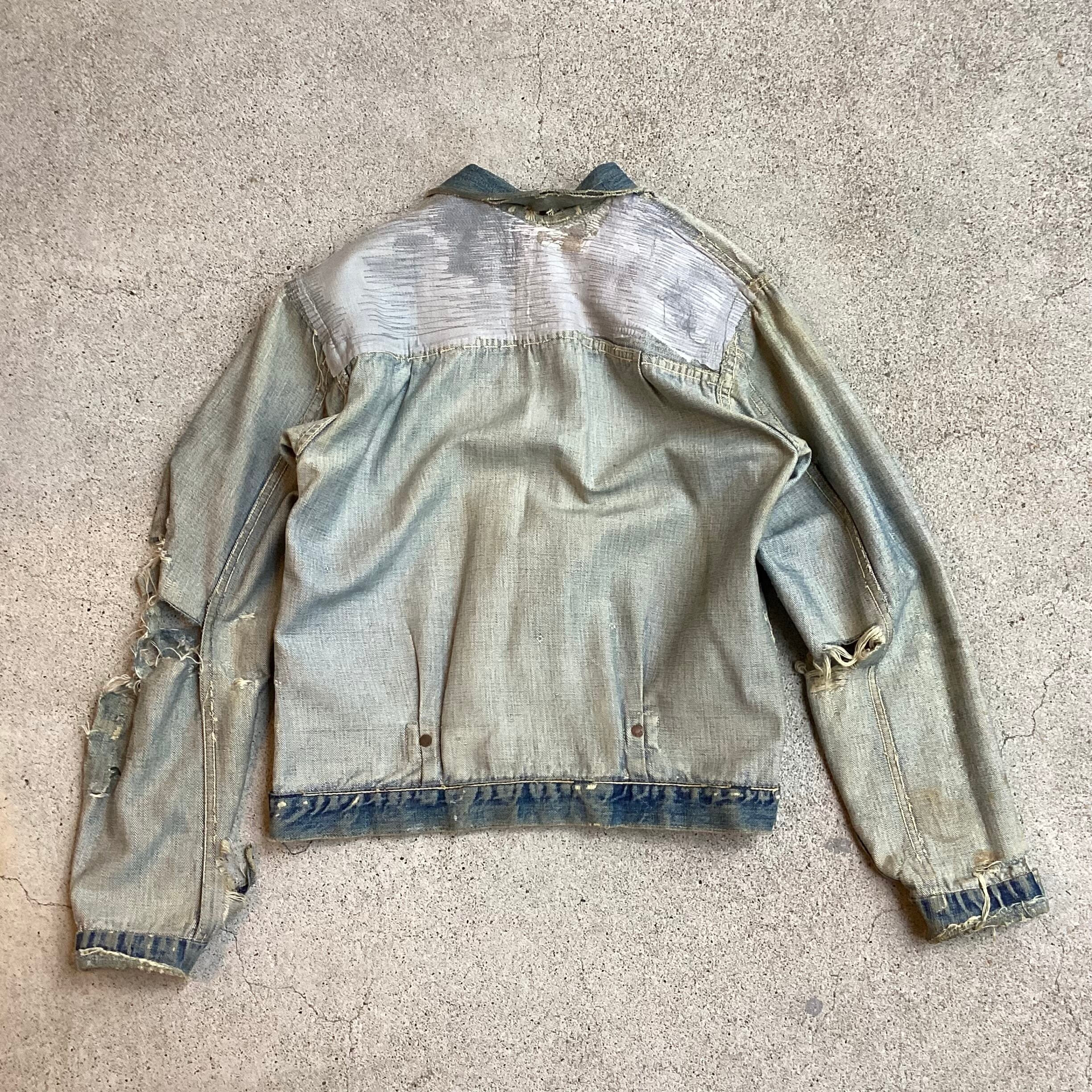 画像の通り、全体的にダメージが見られます。右袖の破れの補修の仕方がボンドを貼り付けたようなやり方なので着用時にガザっとすると思います。ロンTなど着ていれば違和感なく着用していただけます。後はどんどんきていくことによってステッチやったり生地は破れていくので、そのヴィンテージ、ボロ、雰囲気系に理解のある方のみ、検討してみてください。