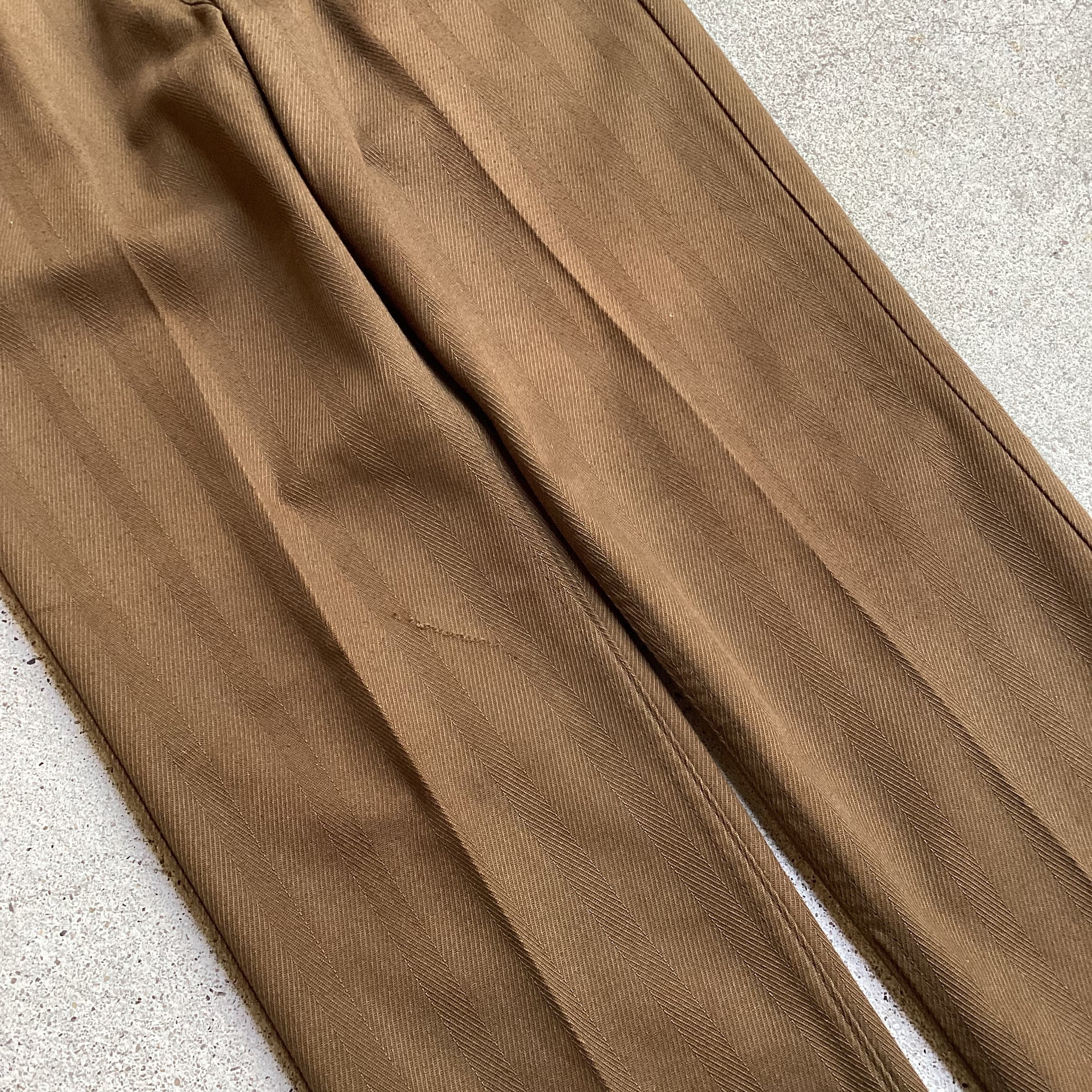 70年代頃のスタープレスト、カジュアルスラックスになります。ヘリンボーンを互い違いに配置し、ストライプを表現したような非常に珍しい柄。カラーも相まってこれからの季節の活躍が増えそうです。サイズ表記不明ですが、実寸34×29といわゆるゴールデンサイズになっておりますので、着用出来る方も多いと思います。黒金タブ、BIG E、ボタン裏刻印も数字1桁としっかり古い一本。お好きな方、珍しい一本をお探しの方は是非。