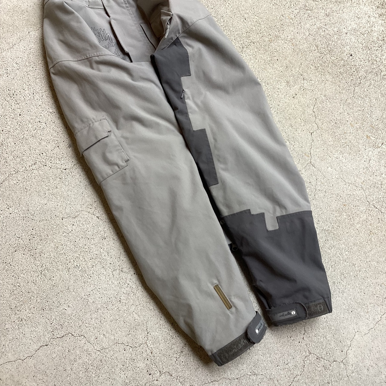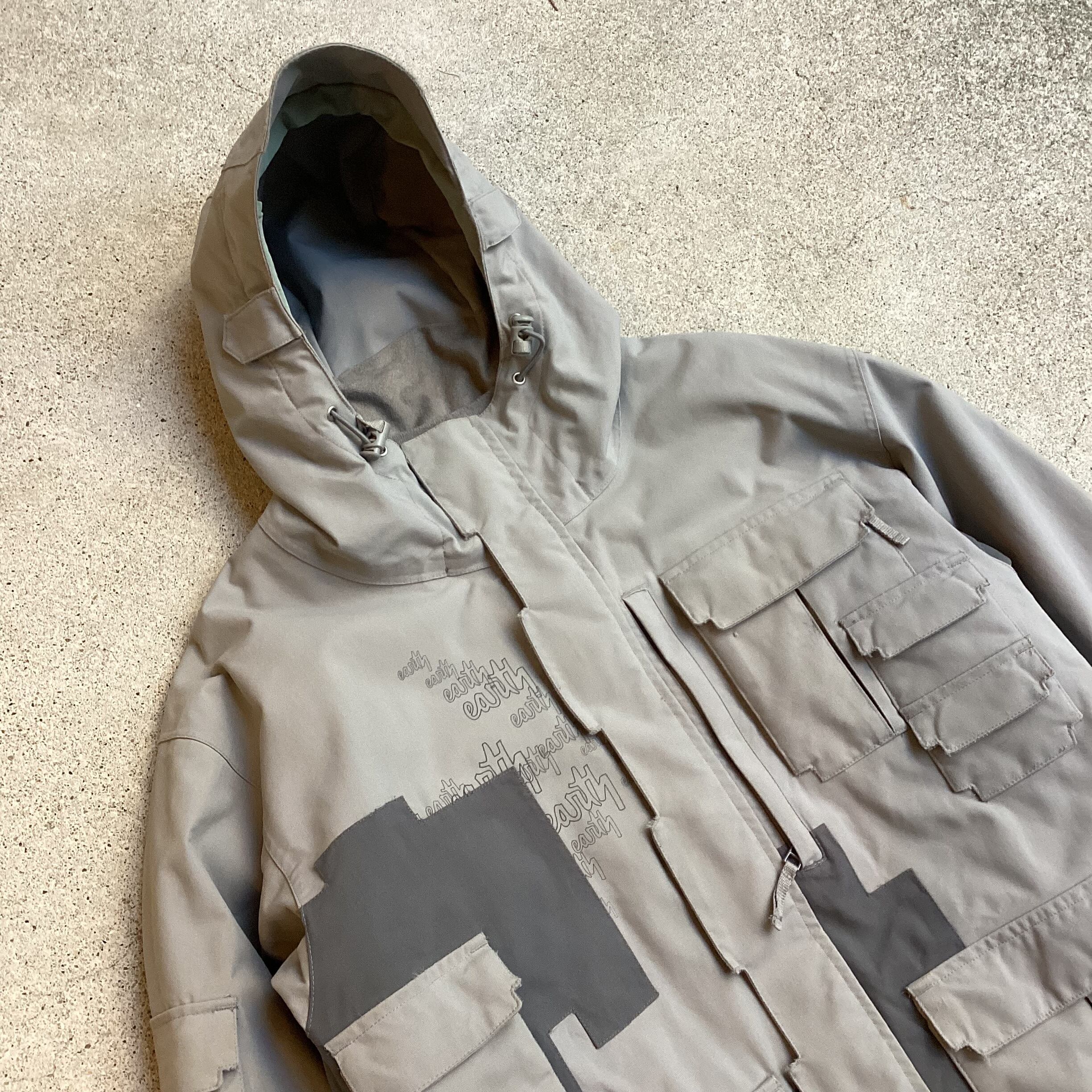 00年代頃のプラネットアース、スノージャケットになります。いわゆるボードウェアですかね。間違いなくあの幻の都市迷彩と言われているTパターンをサンプリングしています。しかもそれをポケットのデザインで表現するという、中々狂ったことをやってます。合計16個ものポケットを完備、目出し帽から、方位磁針、ストラップ、ありとあらゆる雪山で起こりゆる可能性を考えてデザインされているのが伺えます。素晴らしいスノーギアやと思います。雪の侵入を防ぐウエストゴムみたいなやつも取り外しできますし、街着としても間違いなく活躍してくれるでしょう。悪天候の日はこれですね。そしてカバンいらず。ギミック利いたやつお好きな方は是非。