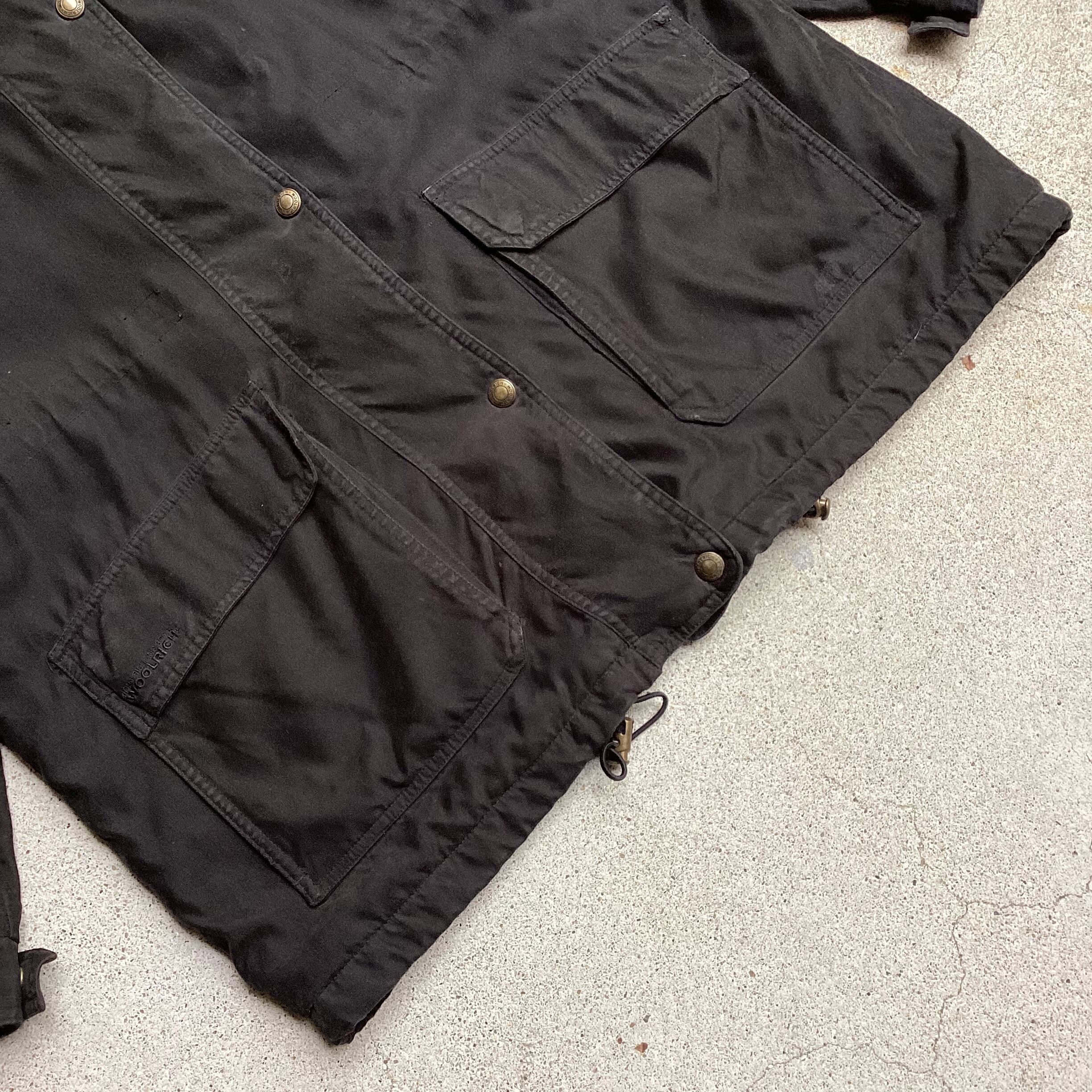 90-00年代頃のウールリッチ、デザインマウンテンパーカーになります。光沢感のあるピーチスキンのような素材感で、多少の雨風も防いでくれる仕様。ポケットもフロントに6つと内ポケ1つ。ライニングはウールリッチらしい配色、素材遣いになってます。裾にもドローコード、ダブルジッパーともう言うことなしの作りになっています。企画はレディースなんですが、余裕でメンズL-XL程度のサイズ感はあります。便利なアウターお探しの方は是非。
