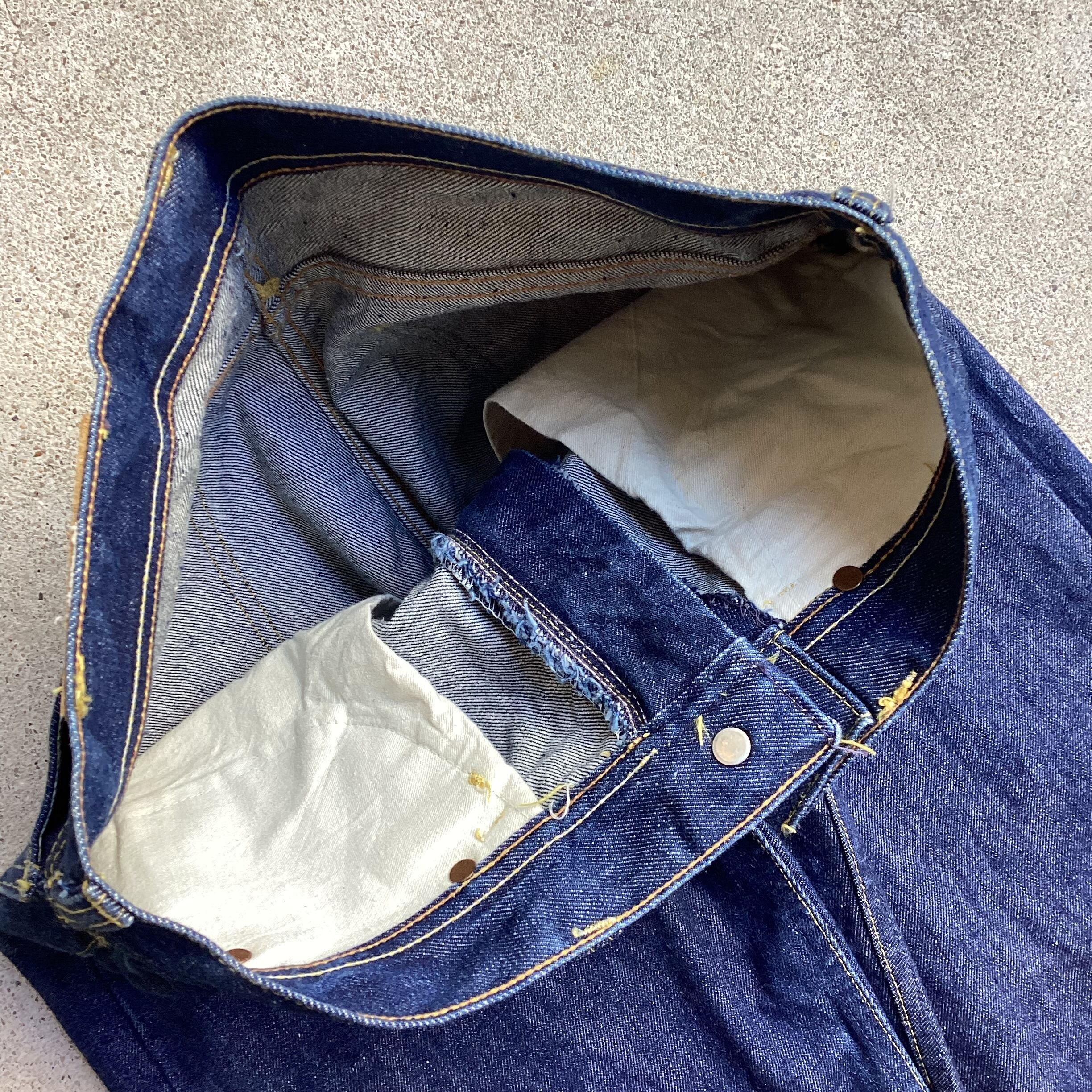 60年代頃のタフナット、デニムパンツになります。リサイズが入っているのかテーパードシルエットが面白い1着。サイドゴアブーツや、ローファーなど、アンクル丈で穿いていただければ、かなり綺麗にまとまると思います。この年代でこの濃さ、まだ生地もバキバキです。ブランドが違うだけでこれだけ差が出るのも古着ならではですね。おんなじデニムの年代で、ブランド気にされない方は是非。かなりお買い得やと思います。
